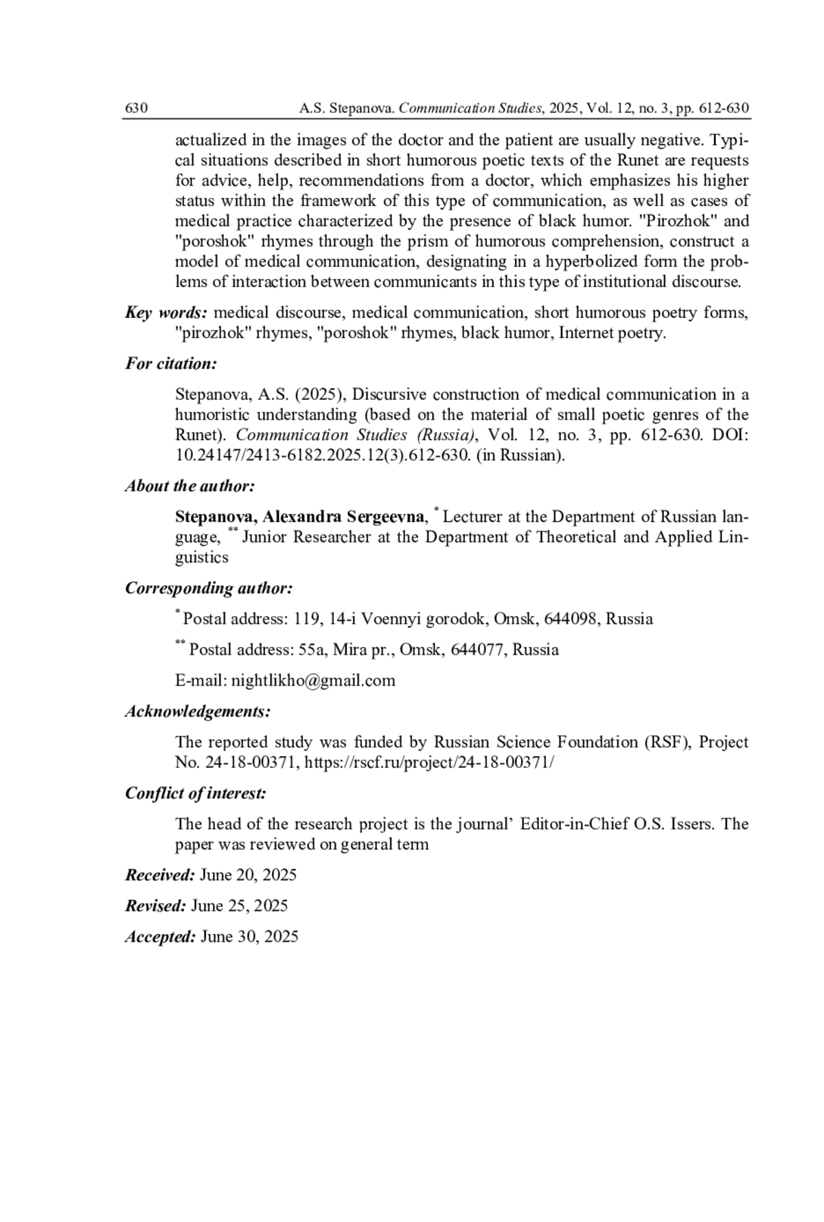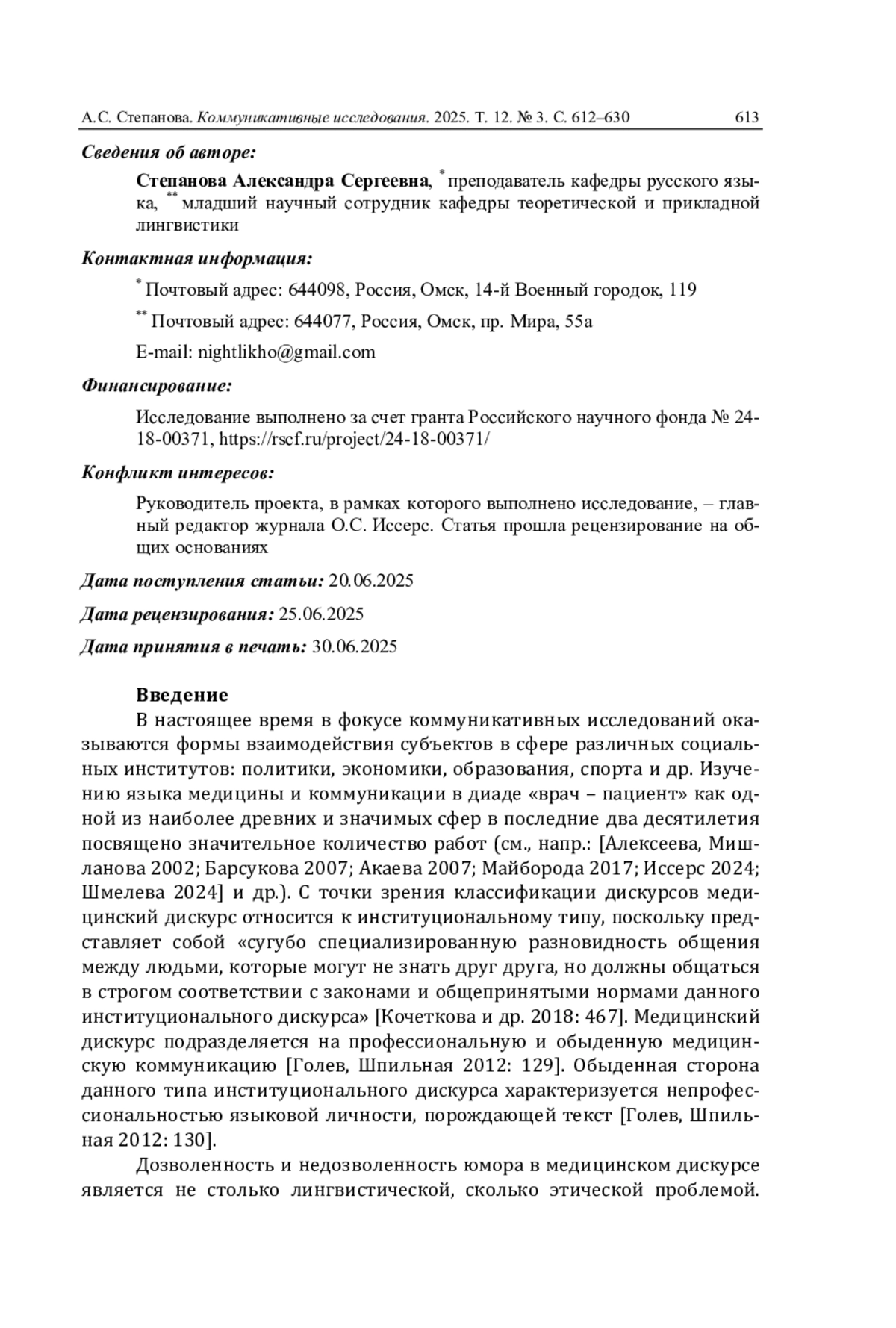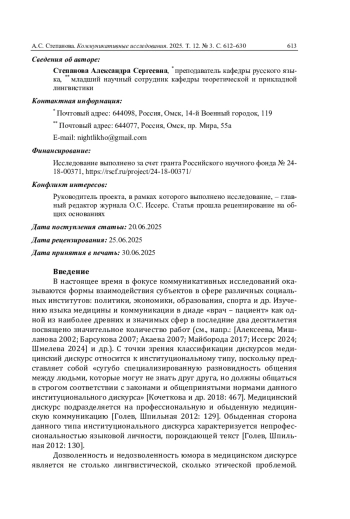 В настоящее время в фокусе коммуникативных исследований оказываются формы взаимодействия субъектов в сфере различных социальных институтов: политики, экономики, образования, спорта и др. Изучению языка медицины и коммуникации в диаде «врач – пациент» как одной из наиболее древних и значимых сфер в последние два десятилетия посвящено значительное количество работ (см., напр.: [Алексеева, Мишланова 2002; Барсукова 2007; Акаева 2007; Майборода 2017; Иссерс 2024; Шмелева 2024] и др.).