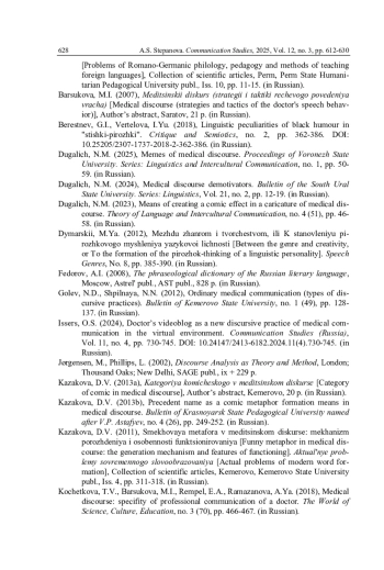 13. Казакова Д.В. Категория комического в медицинском дискурсе: автореф. дис.... канд. филол. наук. Кемерово, 2013a. 20 с. EDN: SFIAPX
