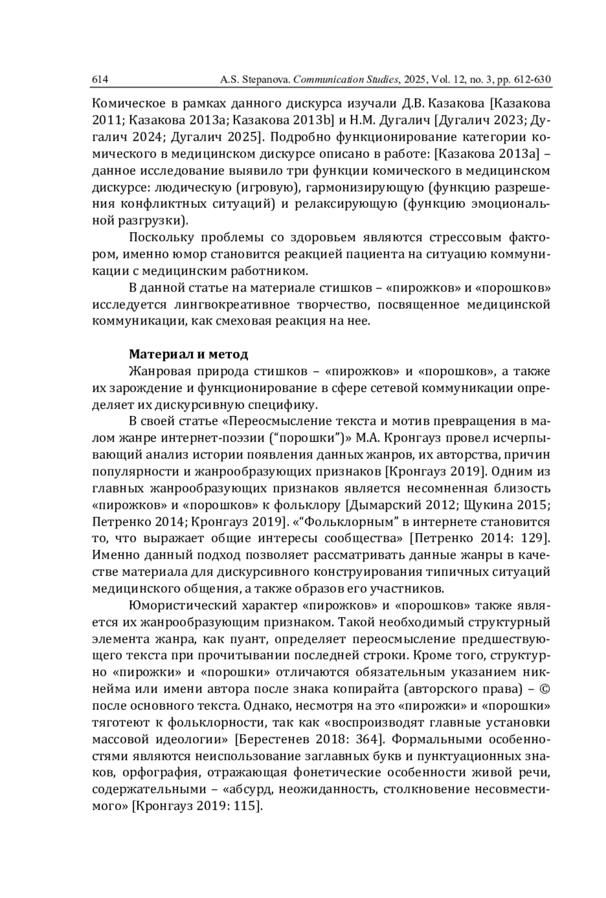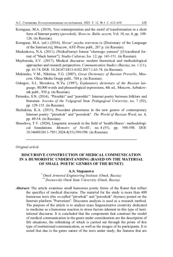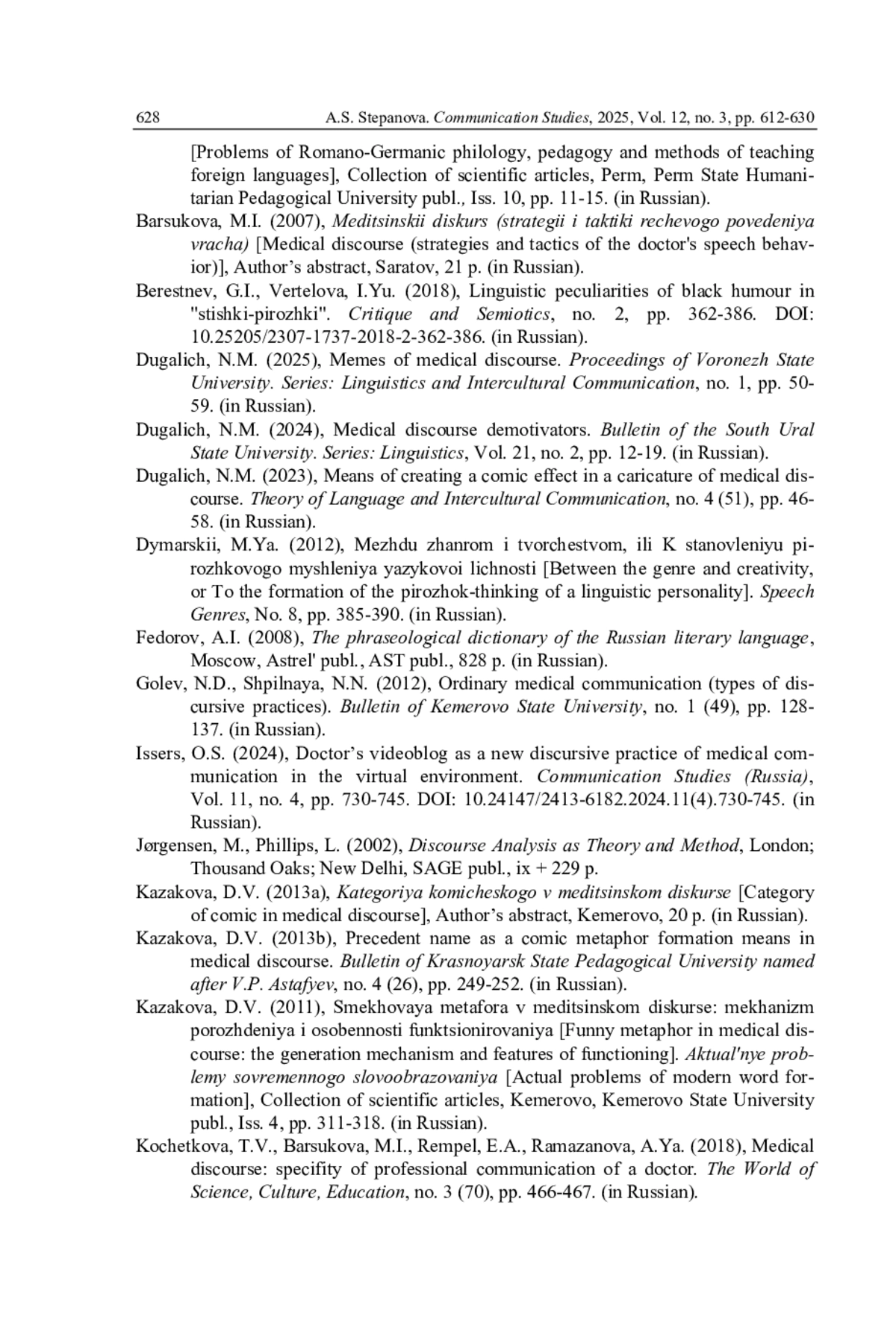7. Дугалич Н.М. Мемы медицинского дискурса // Вестник Воронежского государственного университета. Серия: Лингвистика и межкультурная коммуникация. 2025. № 1. С. 50-59.