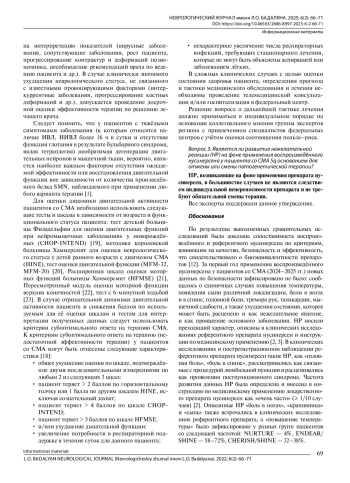 19. Glanzman A.M., Mazzone E., Main M., Pelliccioni M., Wood J., Swoboda K.J., et al. The Children’s Hospital of Philadelphia Infant Test of Neuromuscular Disorders (CHOP INTEND): test development and reliability. Neuromuscul. Disord. 2010; 20(3): 155-61. DOI: 10.1016/j.nmd.2009.11.014