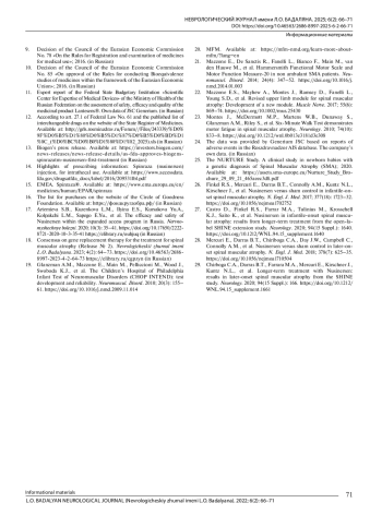 17. Артемьева С.Б., Кузенкова Л.М., Ильина Е.С., Курсакова Ю.А., Колпакчи Л.М., Сапего Е.Ю. и др. Эффективность и безопасность препарата нусинерсен в рамках программы расширенного доступа в России. Нервно-мышечные болезни. 2020; 10(3): 35-41. DOI: 10.17650/2222-8721-2020-10-3-35-41