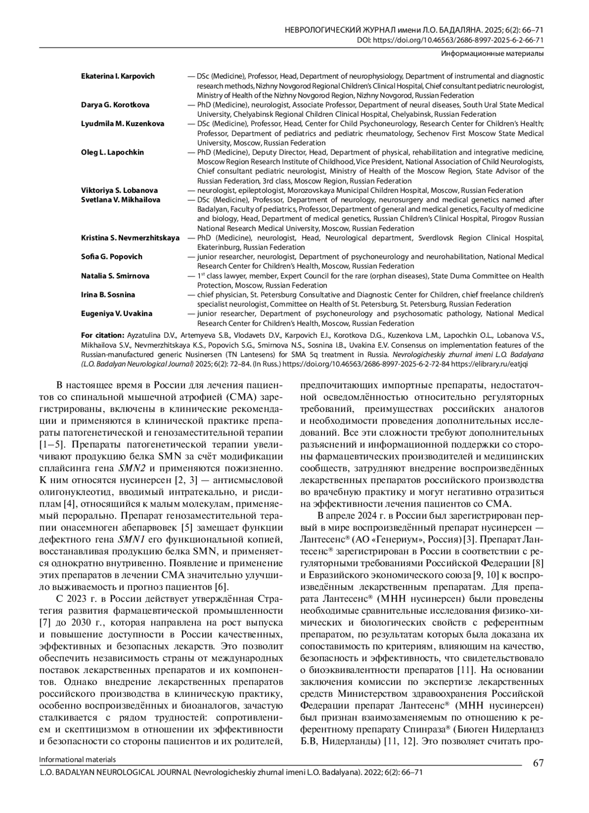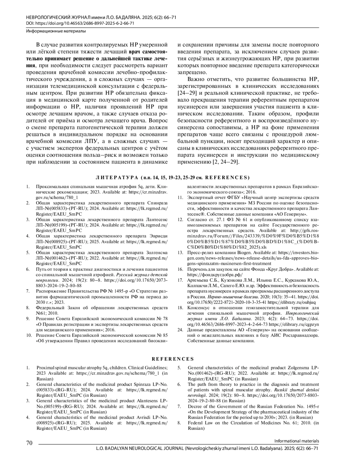 С 2023 г. в России действует утверждённая Стратегия развития фармацевтической промышленности [7] до 2030 г., которая направлена на рост выпуска и повышение доступности в России качественных, эффективных и безопасных лекарств. Это позволит обеспечить независимость страны от международных поставок лекарственных препаратов и их компонентов. Однако внедрение лекарственных препаратов российского производства в клиническую практику, особенно воспроизведённых и биоаналогов, зачастую сталкивается с рядом трудностей: сопротивлением и скептицизмом в отношении их эффективности и безопасности со стороны пациентов и их родителей, предпочитающих импортные препараты, недостаточной осведомлённостью относительно регуляторных требований, преимуществах российских аналогов и необходимости проведения дополнительных исследований. Все эти сложности требуют дополнительных разъяснений и информационной поддержки со стороны фармацевтических производителей и медицинских сообществ, затрудняют внедрение воспроизведённых лекарственных препаратов российского производства во врачебную практику и могут негативно отразиться на эффективности лечения пациентов со СМА.