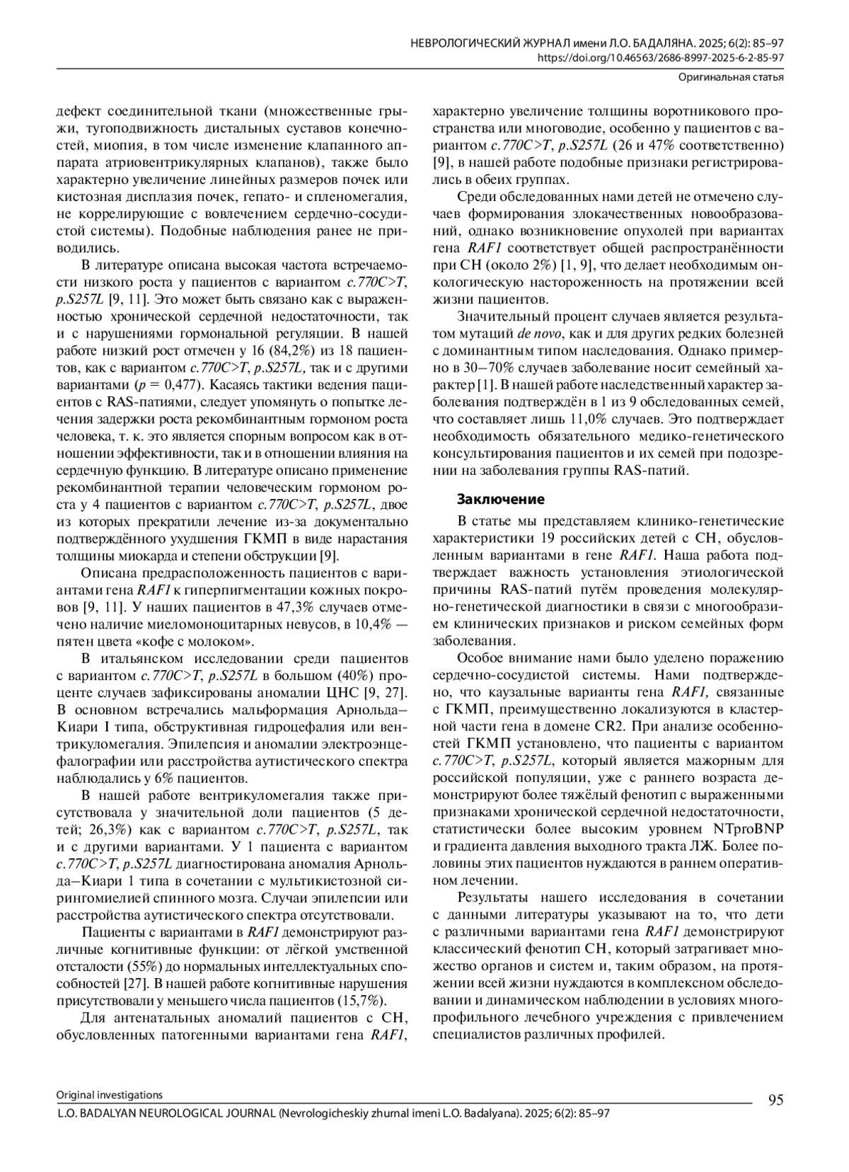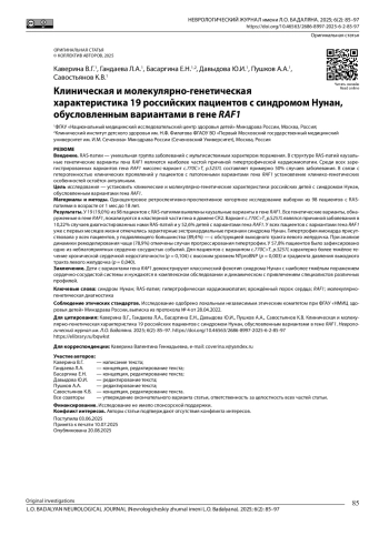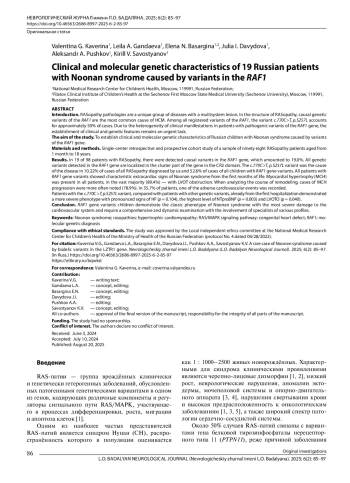 13. Гандаева Л.А., Каверина В.Г., Басаргина Е.Н., Пушков А.А., Савостьянов К.В. Редкий случай синдрома Нунан, обусловленный биаллельными вариантами в гене LZTR1. Неврологический журнал имени Л.О. Бадаляна. 2023; 4(3): 120-9. DOI: 10.46563/2686-8997-2023-4-3-120-129