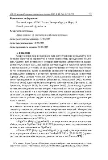 Современный мир переживает бум искусственного интеллекта, корпорации борются за первенство в гонке нейросетей, прежде всего языковых. Однако, при постоянном совершенствовании алгоритмов и расширении обучающей базы, принципы работы моделей остаются прежними, и генерированные тексты до сих пор отличаются от текстов «естественного» порождения. Такое положение определяет и возрастающий исследовательский интерес к вопросам: креативного потенциала нейросетей [Орехов 2017; Цвигун, Черняков 2024]1, использования нейросетей в процессе преподавания и обучения [Ивахненко, Никольский 2023; Сысоев, Филатов 2023], идентификации авторства текста [Горина, Уфимцева 2024; Прохоров, Асадчая 2023; Тельпов, Ларцина 2023]. Даже перед рядовым читателем ежедневно встает вопрос: читаемый им текст создан человеком или машиной? И в некоторых случаях этот вопрос становится принципиальным, например для преподавателя, оценивающего степень самостоятельности работы студента, или издателя, готовящего рукопись романа к печати.