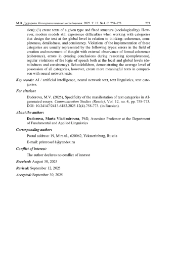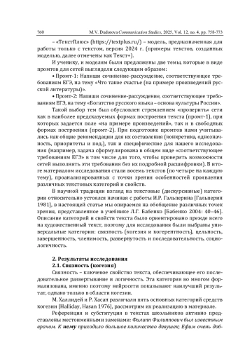 В статье на материале текстов, написанных школьниками и сгенерированных нейросетевыми моделями (YandexGPT, GigaChat, «ТекстПлюс»), проводится исследование таких текстовых категорий и свойств, как связность (когезия и когерентность), цельность, завершенность, членимость, развернутость и последовательность, социологичность, выявляется их специфика в сопоставлении текстов, созданных естественным и искусственным разумом. Анализ показал, что наиболее успешно нейросети обращаются с такими категориями текста, которые могут быть алгоритмизованы: членимость, когезия, социологичность. Так, модели успешно: 1) проводят деление текста на абзацы, сохраняют единство микротемы и используют коннекторы в соответствии с правилами тематического развертывания (членимость); 2) реализуют субституцию (когезия); 3) создают тексты заданного типа и фиксированной структуры (социологичность). Однако современные модели всё еще испытывают трудности при работе с категориями, оформляющими текст на глобальном уровне в соотношении с мышлением: когерентность, завершенность, развернутость и последовательность. Нарушения реализации этих категорий обычно представлены следующими видами: ошибками в области создания и движения мысли при внешнем соблюдении формальной связности (когерентность), ошибки в создании выводов в ходе рассуждения (завершенность), регулярные нарушения логичности речи как на локальном, так и глобальном уровнях (развернутость и последовательность). Школьники, демонстрируя средний уровень владения всеми категориями, создают всё же более осмысленные тексты в сравнении с нейросетевыми.