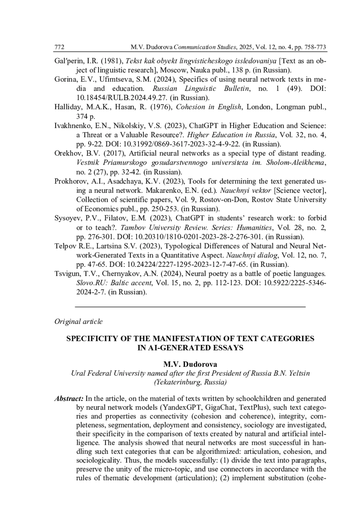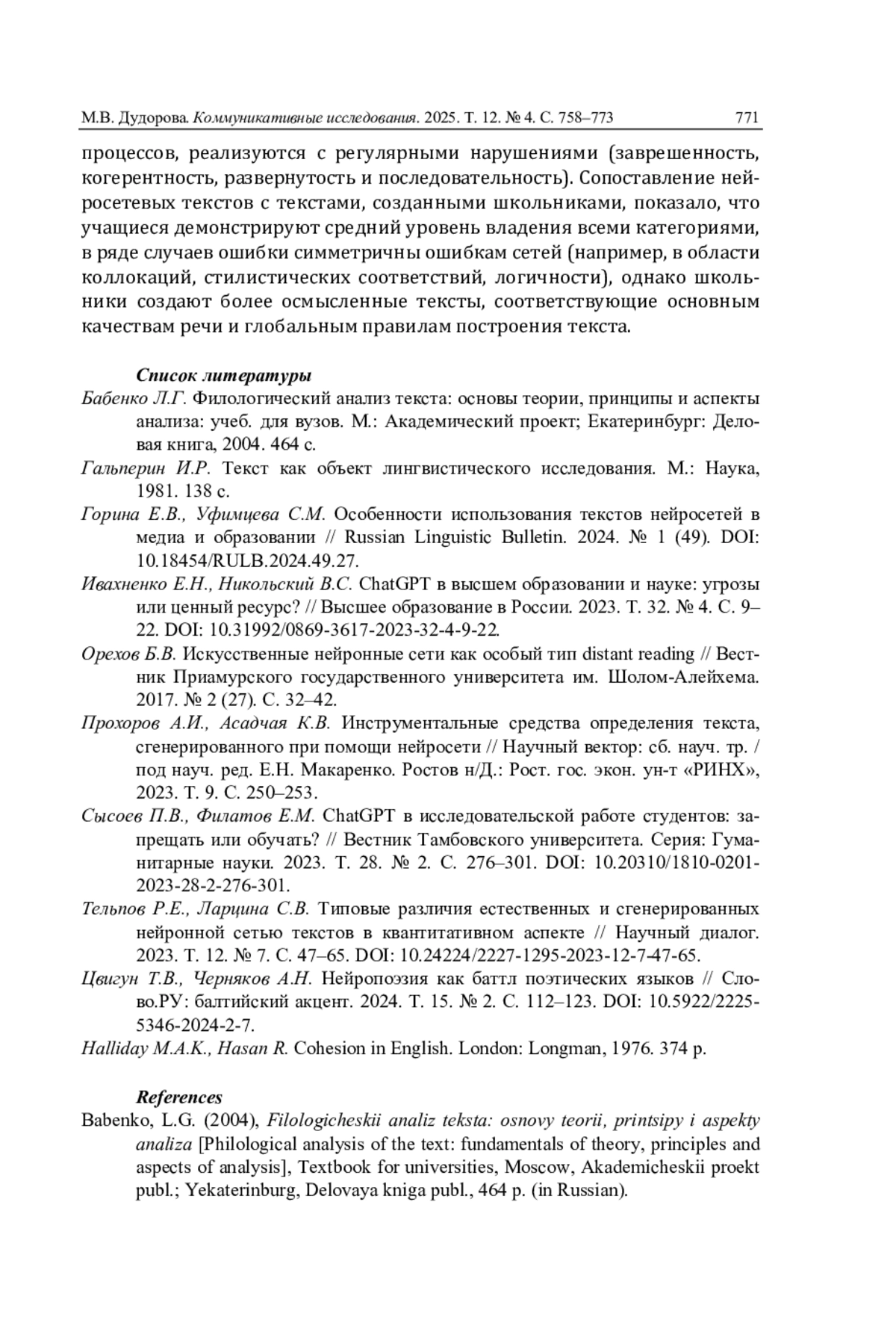 8. Тельпов Р.Е., Ларцина С.В. Типовые различия естественных и сгенерированных нейронной сетью текстов в квантитативном аспекте // Научный диалог. 2023. Т. 12. № 7. С. 47-65. DOI: 10.24224/2227-1295-2023-12-7-47-65 EDN: ZZRRKN