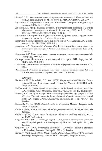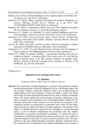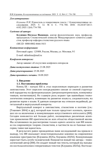 10. Клушина Н.И. Автор, языковая личность и искусственный интеллект // Вестник Московского университета. Серия 9. Филология. 2025б. № 2. С. 20-31. DOI: 10.55959/MSU0130-0075-9-2025-48-02-2 EDN: CXPTBZ