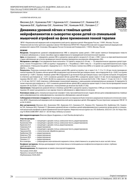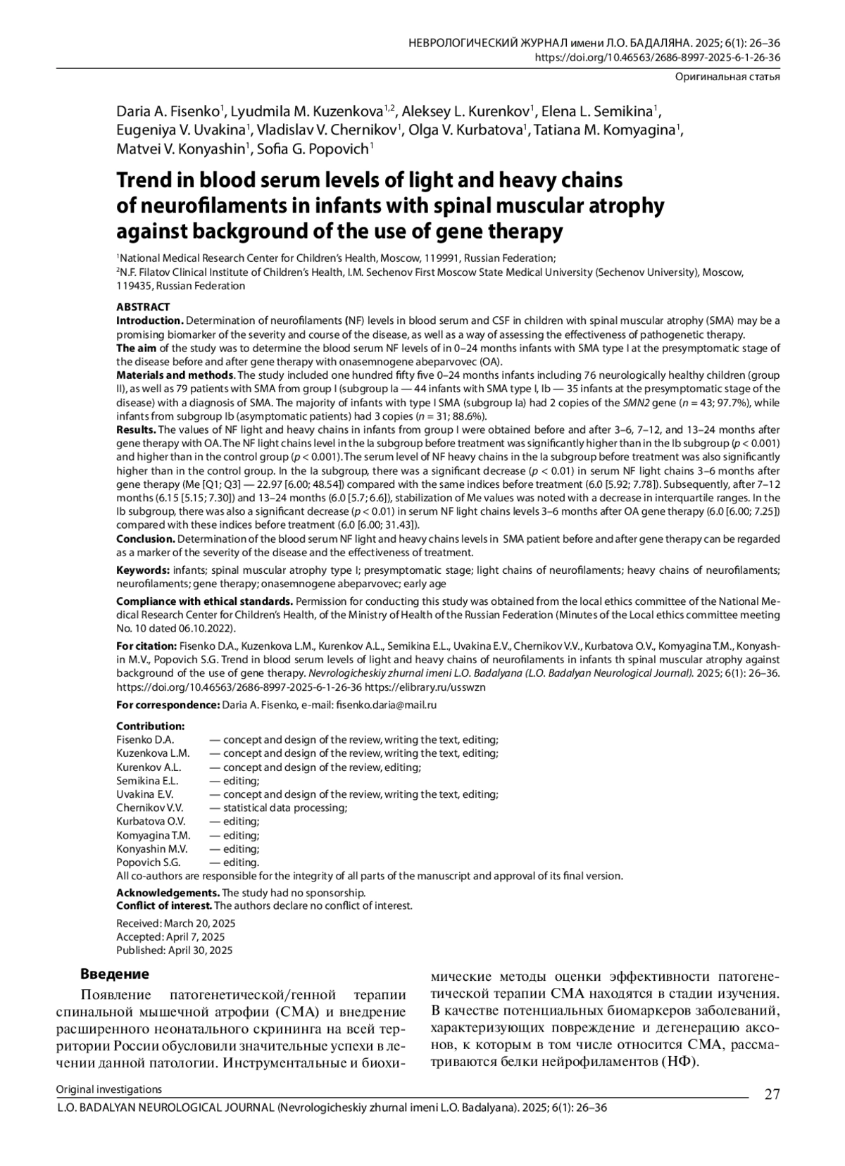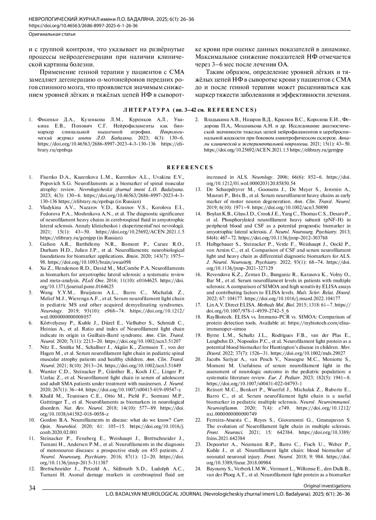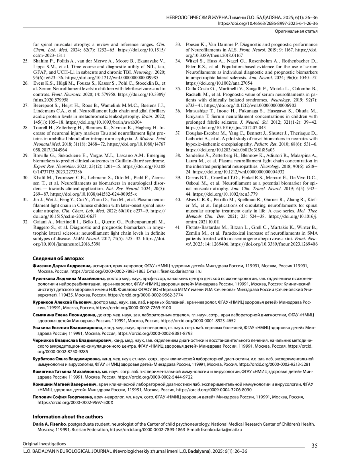 1. Фисенко Д.А., Кузенкова Л.М., Куренков А.Л., Увакина Е.В., Попович С.Г. Нейрофиламенты как биомаркер спинальной мышечной атрофии. Неврологический журнал имени Л.О. Бадаляна. 2023; 4(3): 130-6. DOI: 10.46563/2686-8997-2023-4-3-130-136