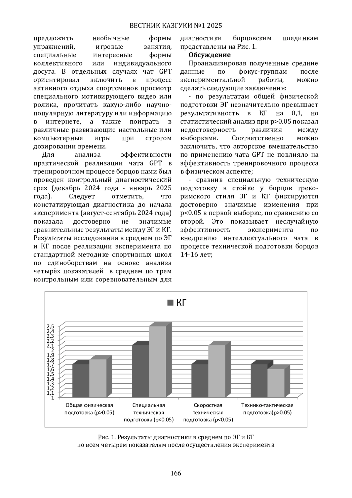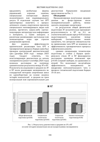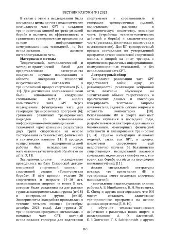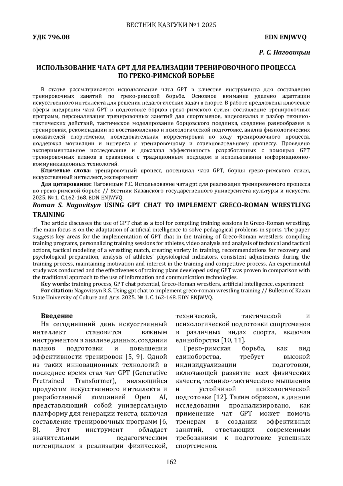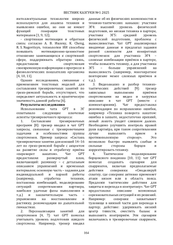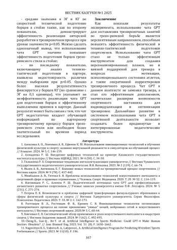 В статье рассматривается использование чата GPT в качестве инструмента для составления тренировочных занятий по греко-римской борьбе. Основное внимание уделено адаптации искусственного интеллекта для решения педагогических задач в спорте. В работе предложены ключевые сферы внедрения чата GPT в подготовке борцов греко-римского стиля: составление тренировочных программ, персонализация тренировочных занятий для спортсменов, видеоанализ и разбор технико-тактических действий, тактическое моделирование борцовского поединка, создание разнообразия в тренировках, рекомендации по восстановлению и психологической подготовке, анализ физиологических показателей спортсменов, последовательная корректировка по ходу тренировочного процесса, поддержка мотивации и интереса к тренировочному и соревновательному процессу. Проведено экспериментальное исследование и доказана эффективность разработанных с помощью GPT тренировочных планов в сравнении с традиционным подходом в использовании информационно-коммуникационных технологий.