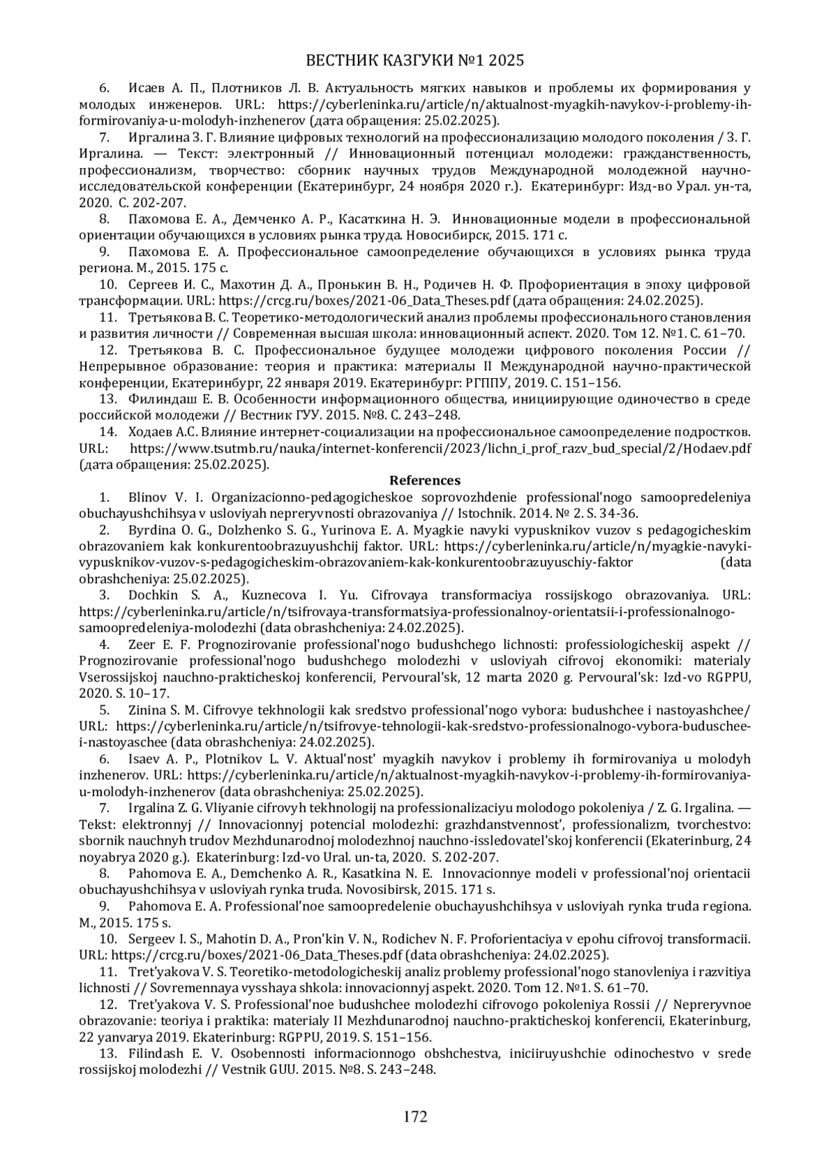 6. Исаев А. П., Плотников Л. В. Актуальность мягких навыков и проблемы их формирования у молодых инженеров. URL: https://cyberleninka.ru/article/n/aktualnost-myagkih-navykov-i-problemy-ih-formirovaniya-u-molodyh-inzhenerov (дата обращения: 25.02.2025).