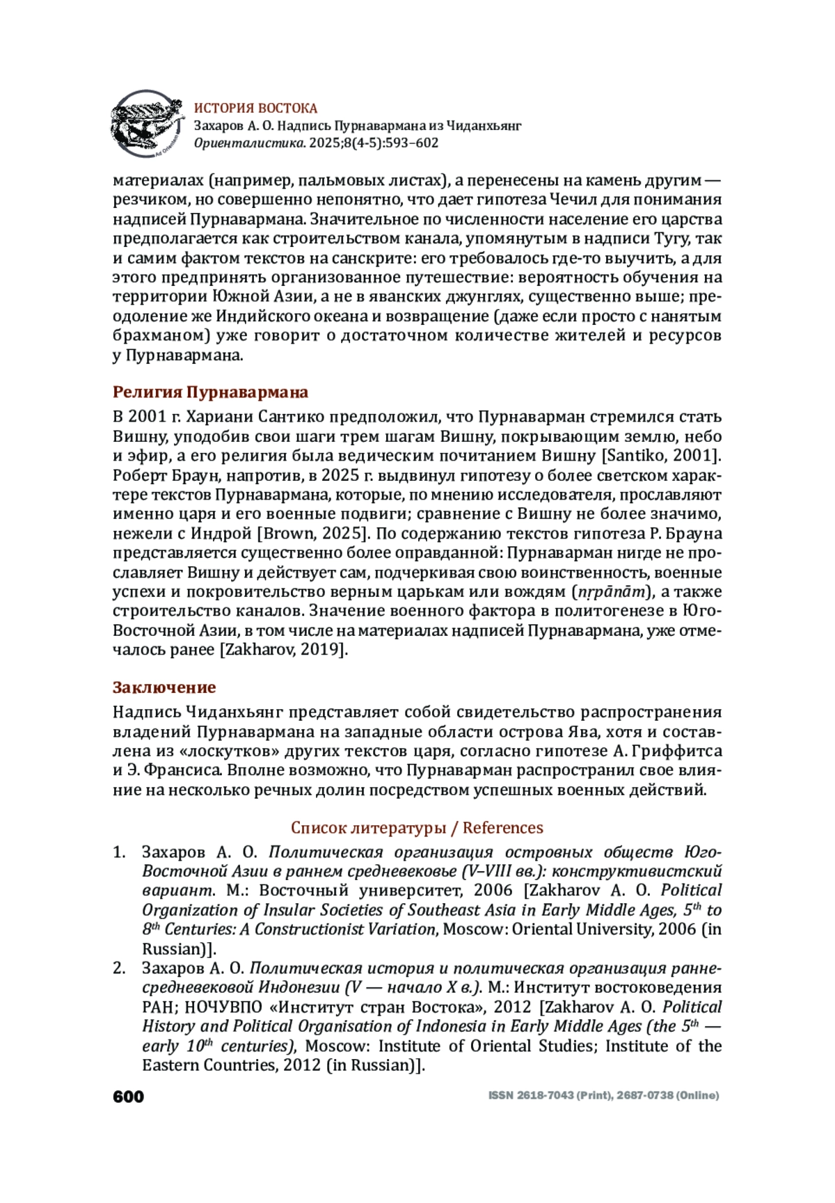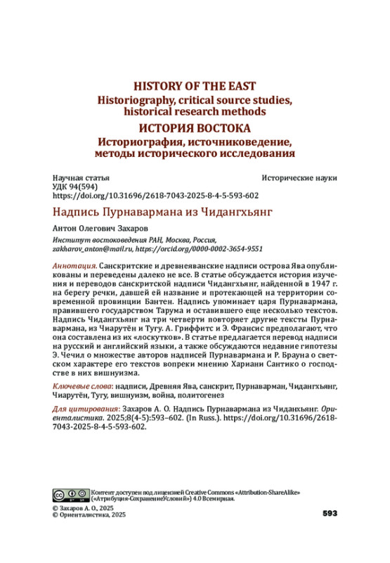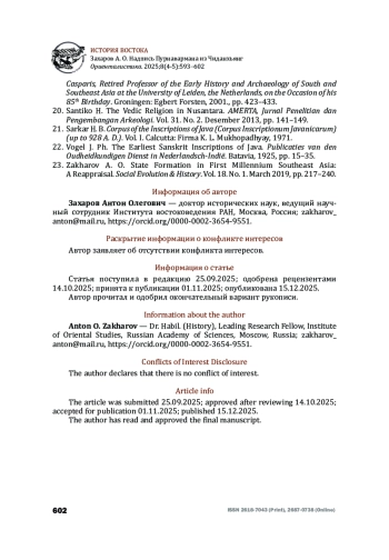 2. Захаров А.О. Политическая история и политическая организация раннесредневековой Индонезии (V - начало X в.). М.: Институт востоковедения РАН, НОЧУВПО “Институт стран Востока”, 2012 [Zakharov, Anton O. Political History and Political Organisation of Indonesia in Early Middle Ages (the 5th - early 10th centuries), Moscow: Institute of Oriental Studies, Institute of the Eastern Countries, 2012 (in Russian)].