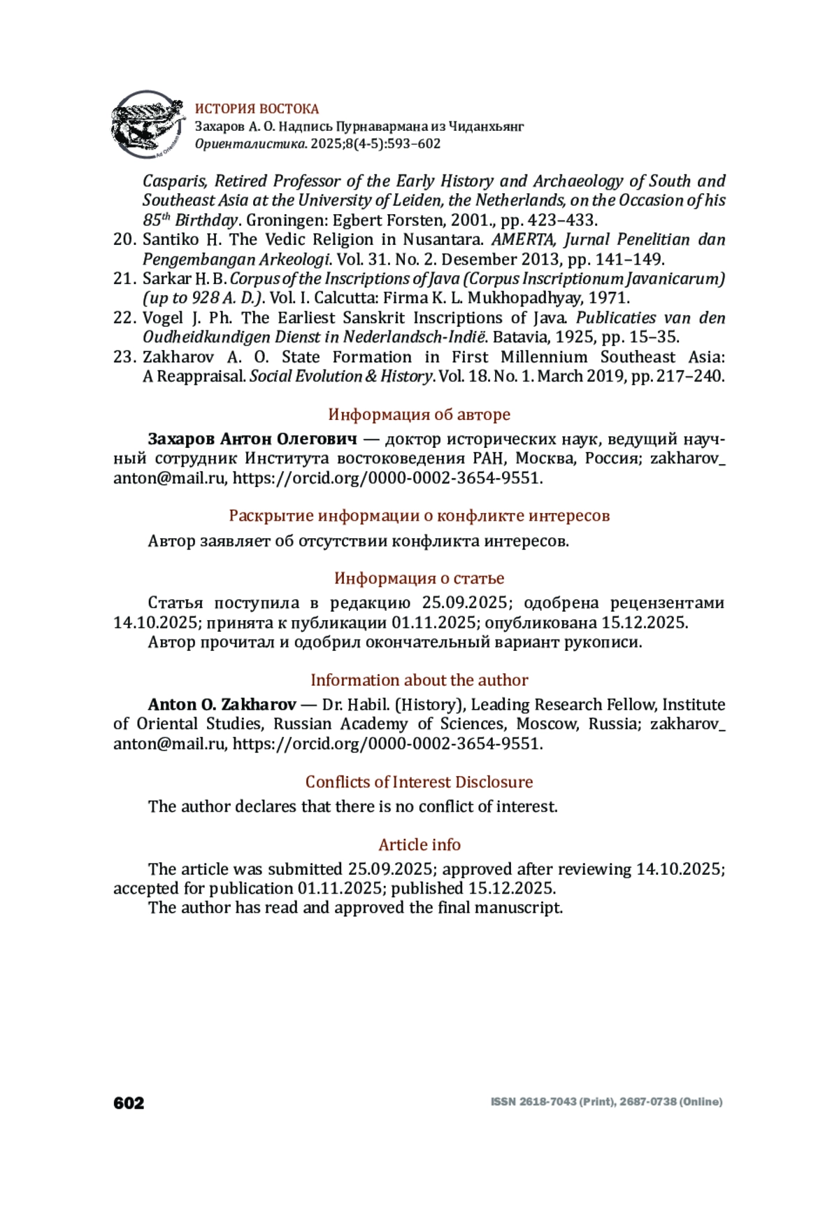23. Zakharov, Anton O. State Formation in First Millennium Southeast Asia: A Reappraisal. Social Evolution & History, Vol. 18, No. 1, March 2019. Pp. 217-240.