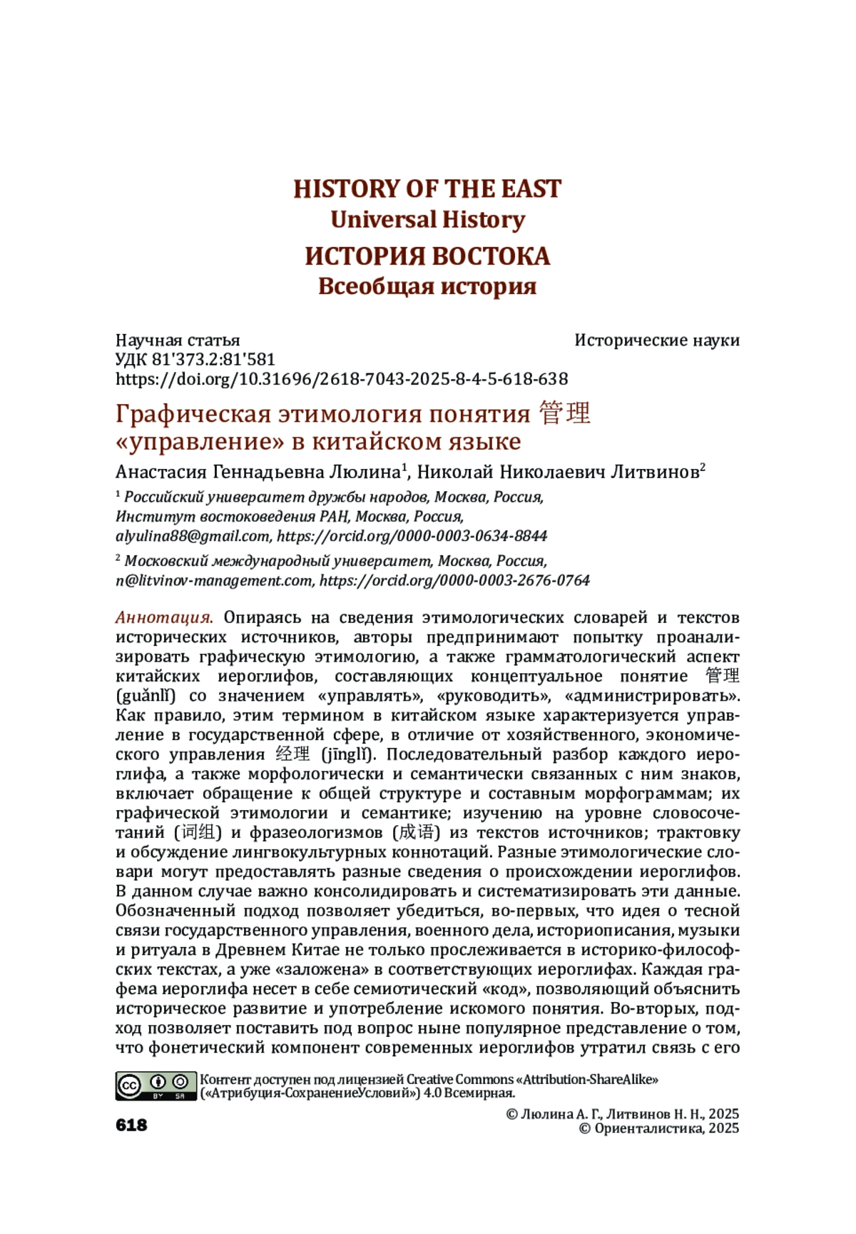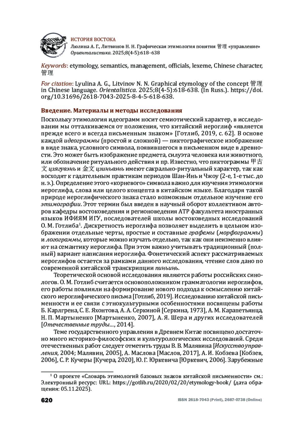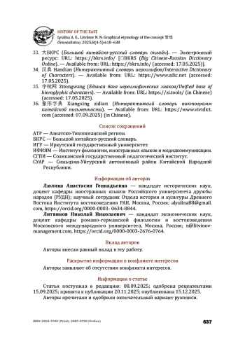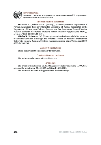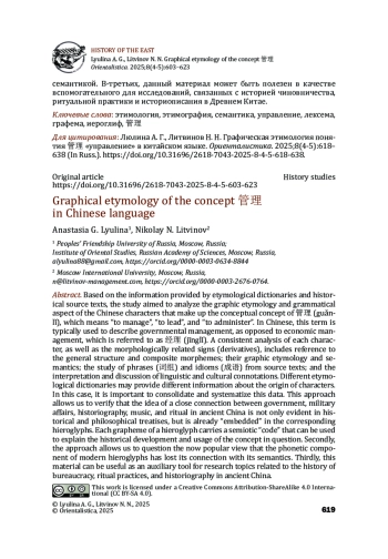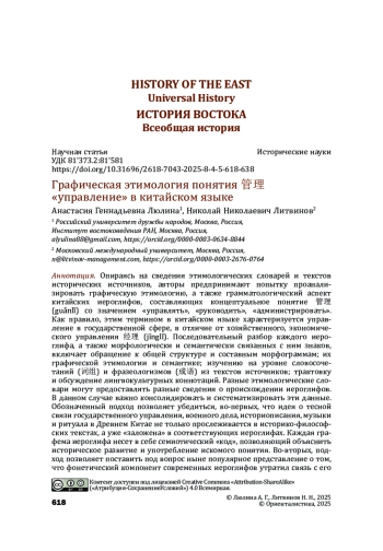 Опираясь на сведения этимологических словарей и текстов исторических источников, авторы предпринимают попытку проанализировать графическую этимологию, а также грамматологический аспект китайских иероглифов, составляющих концептуальное понятие 管理 (guǎnlǐ) со значением «управлять», «руководить», «администрировать». Как правило, этим термином в китайском языке характеризуется управление в государственной сфере, в отличие от хозяйственного, экономического управления 经理 (jīnglǐ). Последовательный разбор каждого иероглифа, а также морфологически и семантически связанных с ним знаков, включает обращение к общей структуре и составным морфограммам; их графической этимологии и семантике; изучению на уровне словосочетаний (词组) и фразеологизмов (成语) из текстов источников; трактовку и обсуждение лингвокультурных коннотаций. Разные этимологические словари могут предоставлять разные сведения о происхождении иероглифов. В данном случае важно консолидировать и систематизировать эти данные. Обозначенный подход позволяет убедиться, во-первых, что идея о тесной связи государственного управления, военного дела, историописания, музыки и ритуала в Древнем Китае не только прослеживается в историко-философских текстах, а уже «заложена» в соответствующих иероглифах. Каждая графема иероглифа несет в себе семиотический «код», позволяющий объяснить историческое развитие и употребление искомого понятия. Во-вторых, подход позволяет поставить под вопрос ныне популярное представление о том, что фонетический компонент современных иероглифов утратил связь с его семантикой. В-третьих, данный материал может быть полезен в качестве вспомогательного для исследований, связанных с историей чиновничества, ритуальной практики и историописания в Древнем Китае.