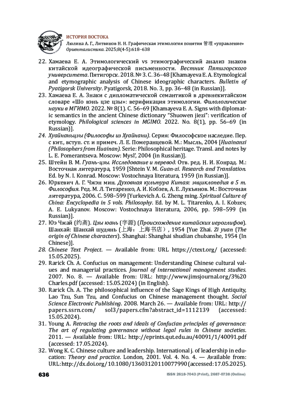 23. Хамаева Е. А. Знаки с дипломатической семантикой в древнекитайском словаре “Шо вэнь цзе цзы”: верификация этимологии. Филологические науки в МГИМО. 2022. № 8(1). С. 56-69 [Khamayeva E. A. Signs with diplomatic semantics in the ancient Chinese dictionary “Shuowen jiezi”: verification of etymology. Philological sciences in MGIMO. 2022. No. 8(1), pp. 56-69 (in Russian)].