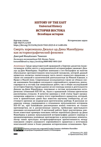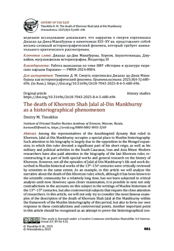 Среди представителей правившей в Хорезме династии Ануштегинидов особое место в мусульманской историографии занимает Джалал ад-Дин Манкбурны. Подобное внимание к его биографии во многом обусловлено противостоянием монгольской экспансии, которой данный правитель посвятил значительную часть своего недолгого правления, а также его военной и политической деятельностью на Южном Кавказе, в Иране и Малой Азии. Современные исследователи также не обошли своим вниманием биографию последнего хорезмийского правителя, реконструируя ее в составе как специальных работ, так и общих исследований по истории Хорезма. Однако далеко не все эпизоды жизни и деятельности Джалал ад-Дина Манкбурны, описанные в составе мусульманских исторических сочинений XIII–XV вв., были в одинаковой степени критически рассмотрены учеными. В качестве примера в этой статье будет проанализирован нарратив о смерти этого хорезмийского правителя, который, хотя и сравнительно давно был известен научному сообществу, до настоящего времени не подвергался критическому разбору. В рассказах по данному поводу, содержащихся в сочинениях мусульманских историков XIII–XV вв., при ближайшем рассмотрении можно отметить не только противоречия, но и дискуссионные сюжеты, требующие пристального внимания исследователей. В настоящей работе будут рассмотрены наиболее известные примеры описания гибели хорезмшаха Джалал ад-Дина Манкбурны в рамках мусульманской историографии данного периода и проанализированы указанные противоречия и дискуссионные моменты. Автор также проследил историографическую преемственность между описанием смерти указанного хорезмийского правителя в источниках монгольской эпохи и более ранними историческими сочинениями. Проведенное исследование доказывает, что нарратив о смерти хорезмшаха Джалал ад-Дина Манкбурны в памятниках XIII–XV вв. представляет собой весьма сложный историографический й требует внимательного критического рассмотрения.