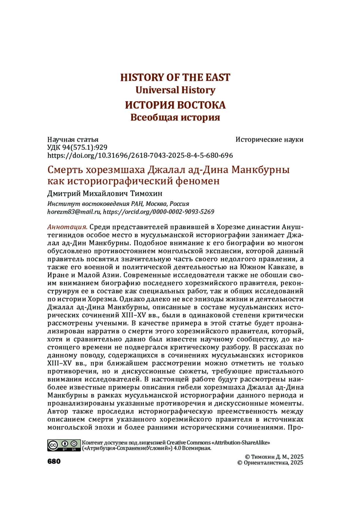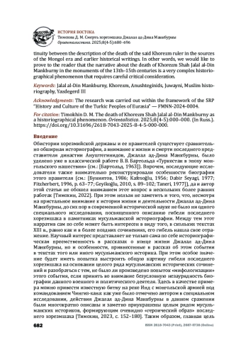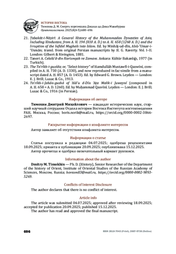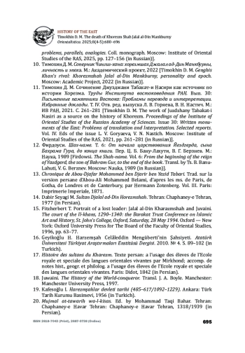 11. Тимохин Д. М. Сочинение Джузджани Табакат и Насири как источник по истории Хорезма. Труды Института востоковедения РАН. Вып. 30: Письменные памятники Востока: Проблемы перевода и интерпретации. Избранные доклады. Т. IV. Отв. ред. выпуска Л. В. Горяева, В. Н. Настич. М.: ИВ РАН, 2021. С. 261-281 [Timokhin D. M. The work of Juzdzhany Tabakat i Nasiri as a source on the history of Khorezm. Proceedings of the Institute of Oriental Studies of the Russian Academy of Sciences. Issue 30: Written monuments of the East: Problems of translation and Interpretation. Selected reports. Vol. IV. Eds of the issue L. V. Goryaeva, V. N. Nastich. Moscow: Institute of Oriental Studies of the RAS, 2021, pp. 261-281 (in Russian)].