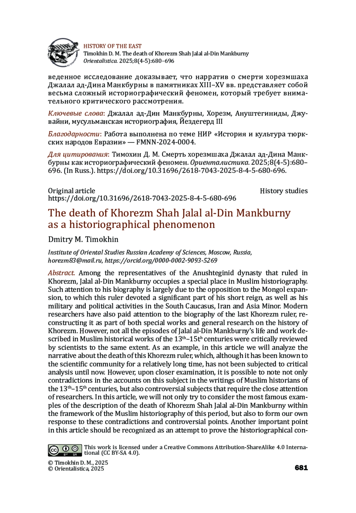 8. Тимохин Д. М. Джалал ад-Дин Манкбурны и хорезмийское присутствие в Северной Индии. ALAICA-II. Сборник статей в честь 90-летия Леонида Борисовича Алаева. Cост. А. Д. Васильев, отв. ред. Л. В. Зеленина. М.: ИВ РАН, 2023. С. 152-180 [Timokhin D. M. Jalal al-Din Mankburny and khorezmian presence in northern India. ALAICA-II. collection of articles in honor of the 90th anniversary of Leonid Borisovich Alaev. Comp. A. D. Vasiliev, resp. ed. L. V. Zelenin. Moscow: Institute of Oriental Studiesof the RAS, 2023, pp. 152-180 (in Russian)].