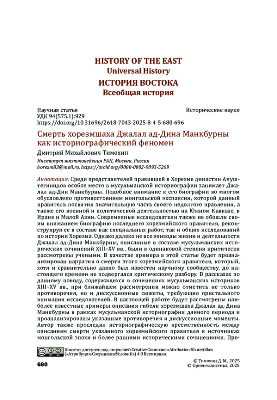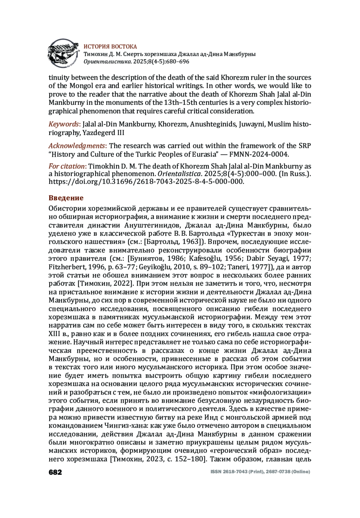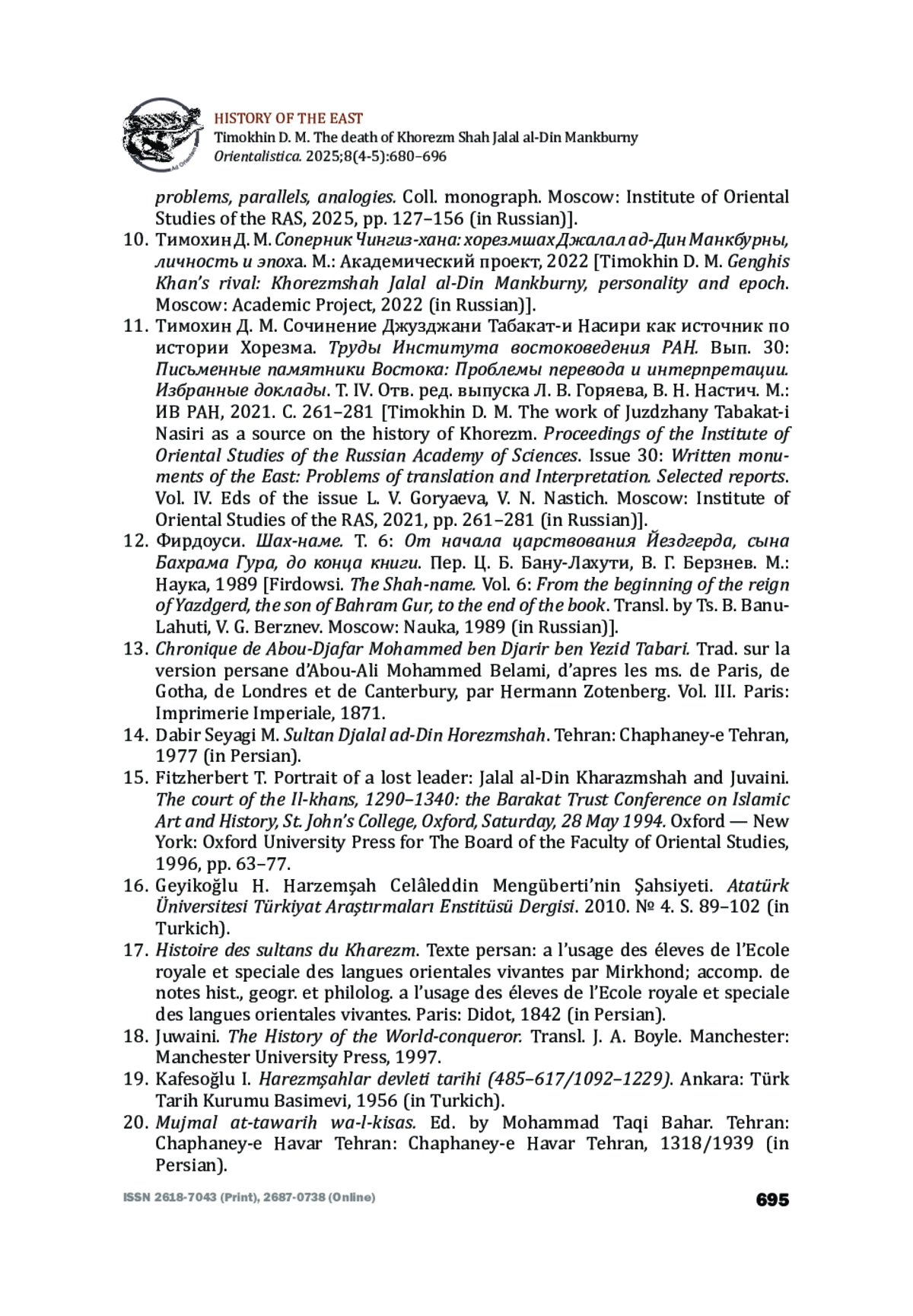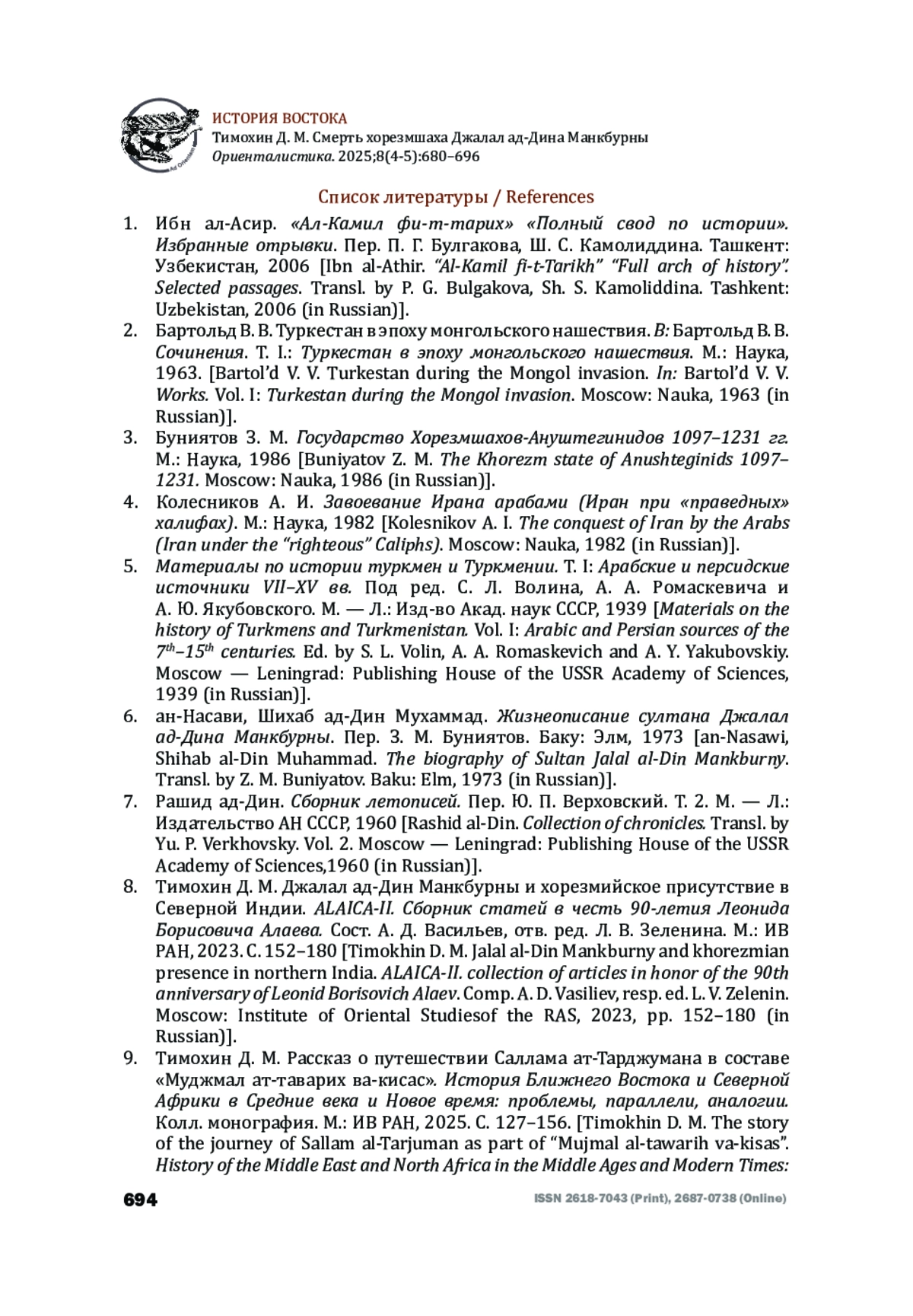 10. Тимохин Д. М. Соперник Чингиз хана: хорезмшах Джалал ад Дин Манкбурны, личность и эпоха. М.: Академический проект, 2022 [Timokhin D. M. Genghis Khan’s rival: Khorezmshah Jalal al-Din Mankburny, personality and epoch. Moscow: Academic Project, 2022 (in Russian)].