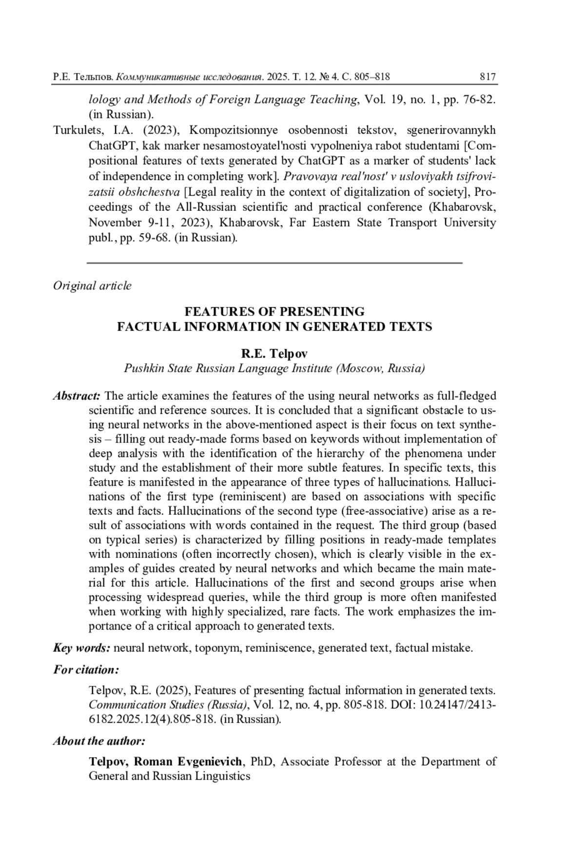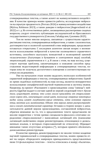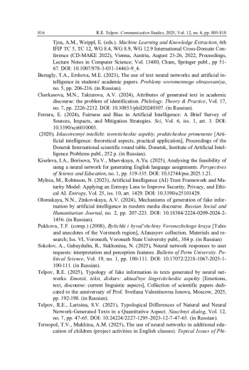 8. Тельпов Р.Е. Типология фейковой информации в текстах, сгенерированных нейросетями // Эмоции, текст, дискурс: актуальные лингвистические аспекты: сб. науч. трудов, посвящ. юбилею проф. Светланы Валентиновны Ионовой. М., 2025. С. 192-198. EDN: HGLIAG