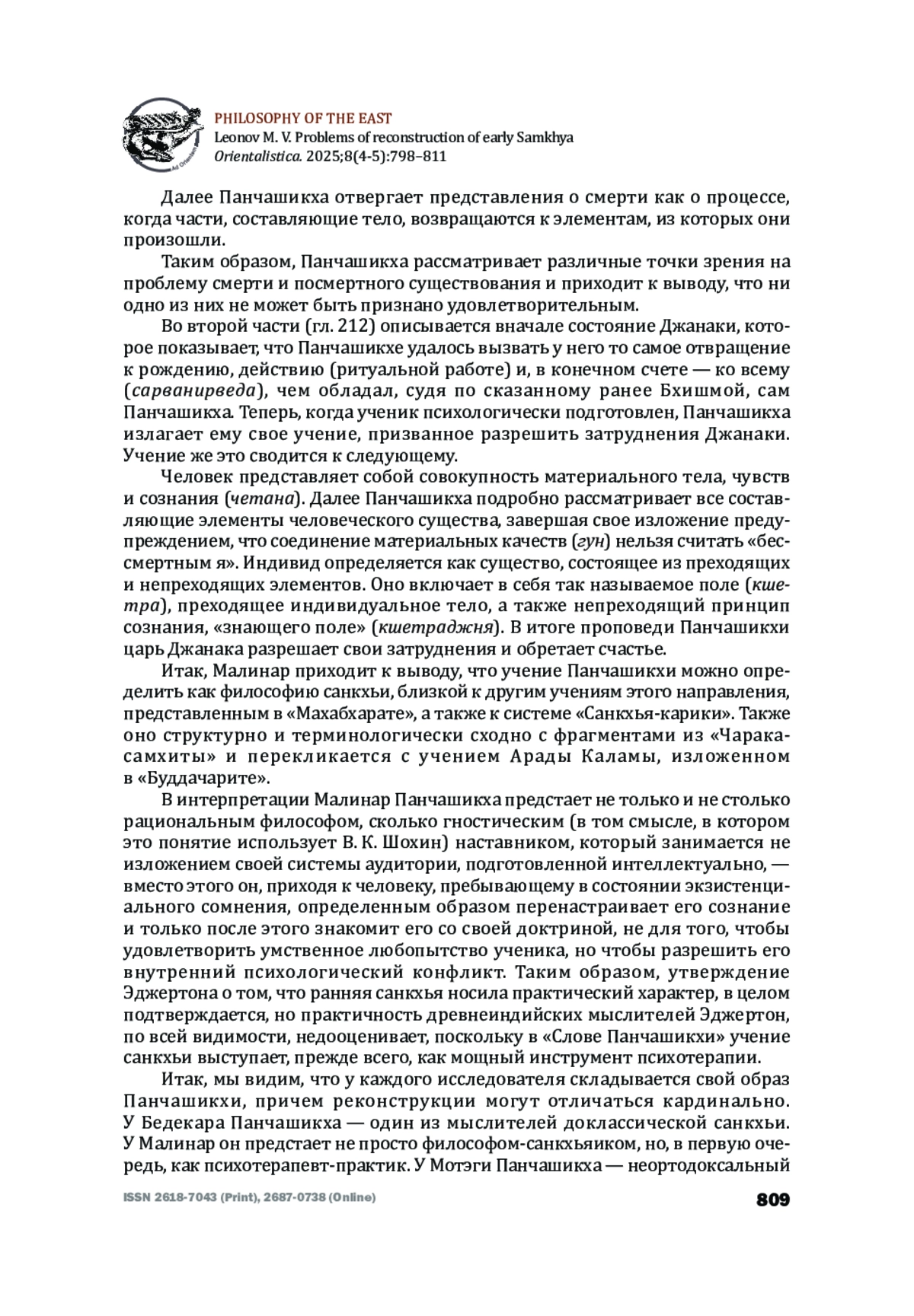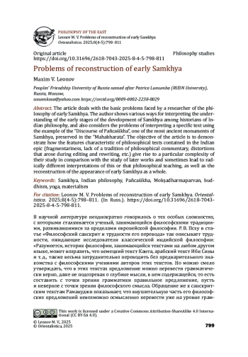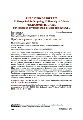 Статья посвящена основным проблемам, с которыми сталкивается исследователь философии ранней санкхьи. Автор показывает различные варианты интерпретации понимания ранних этапов развития санкхьи у историков индийской философии, а также рассматривает проблемы интерпретации конкретного текста на примере «Слова Панчашикхи», одного из древнейших памятников санкхьи, сохранившегося в составе «Махабхараты». Задачей статьи является продемонстрировать, как особенности, характерные для философских текстов, содержащихся в индийском эпосе (фрагментарность, отсутствие традиции философского комментирования, искажения, возникшие при редактировании и переписывании и т. п.), порождают особую сложность их изучения сравнительно с исследованием более поздних произведений и приводят к порою кардинально различным трактовкам того или иного философского учения, а также реконструкции облика ранней санкхьи в целом.