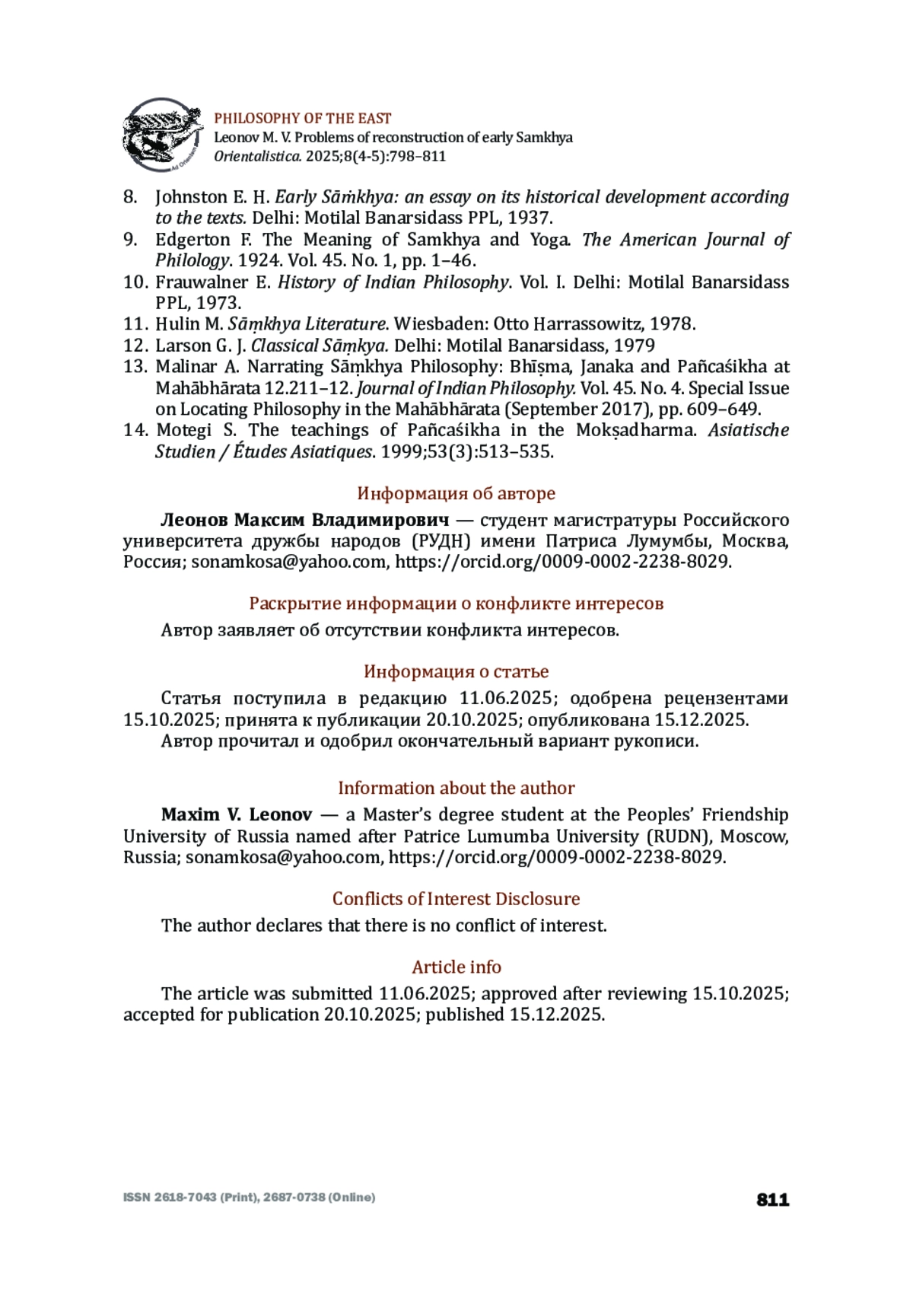 10. Malinar, A. Narrating Sāṃkhya Philosophy: Bhīṣma, Janaka and Pañcaśikha at Mahābhārata 12.211-12 // Journal of Indian Philosophy. Vol. 45, No. 4, Special Issue on Locating Philosophy in the Mahābhārata (September 2017), pp. 609-649.