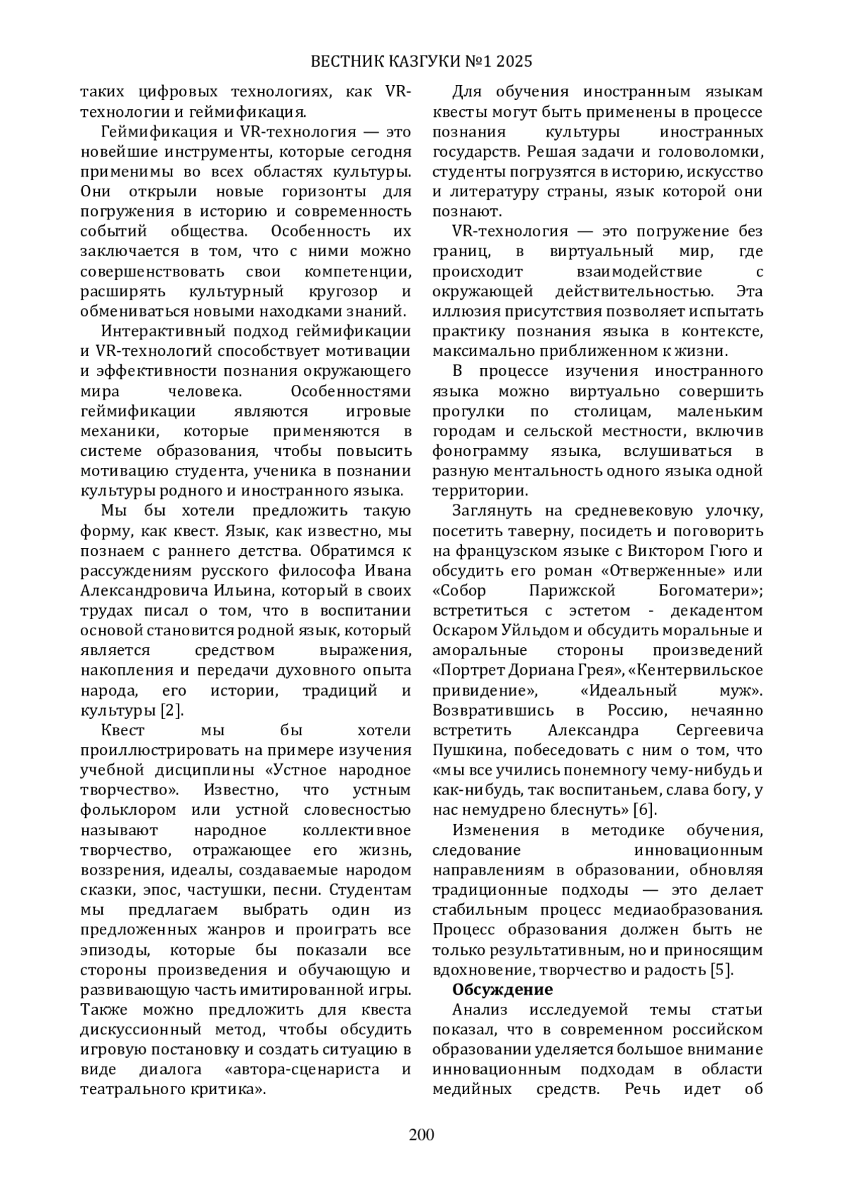Особое внимание обращено на такие инновационные технологии, которые уже оправдали себя. Это геймификация и VR-технология. В своей практике авторы применяют их в методике преподавания иностранных языков и предметов гуманитарного цикла. Они отмечают, что геймификация и VR-технология в рамках междисциплинарного подхода создают в учебном процессе комфортные отношения между педагогом и студентами.