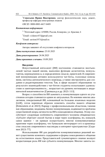 Искусственный интеллект (ИИ) постепенно становится неотъемлемой частью нашей жизни, выполняя функции ассистентов, консультантов, переводчиков и, в определенном смысле, приятелей. В современной коммуникации активно используются чат-боты, голосовые помощники, системы автоматического перевода, а также инструменты для создания и редактирования текстов. Так, в сфере высшего образования «в результате взаимодействия с чат-ботом студенты испытывают удовольствие и заинтересованность… возрастает их уровень мотивации и академической вовлеченности» [Гринвальд и др. 2023: 113].