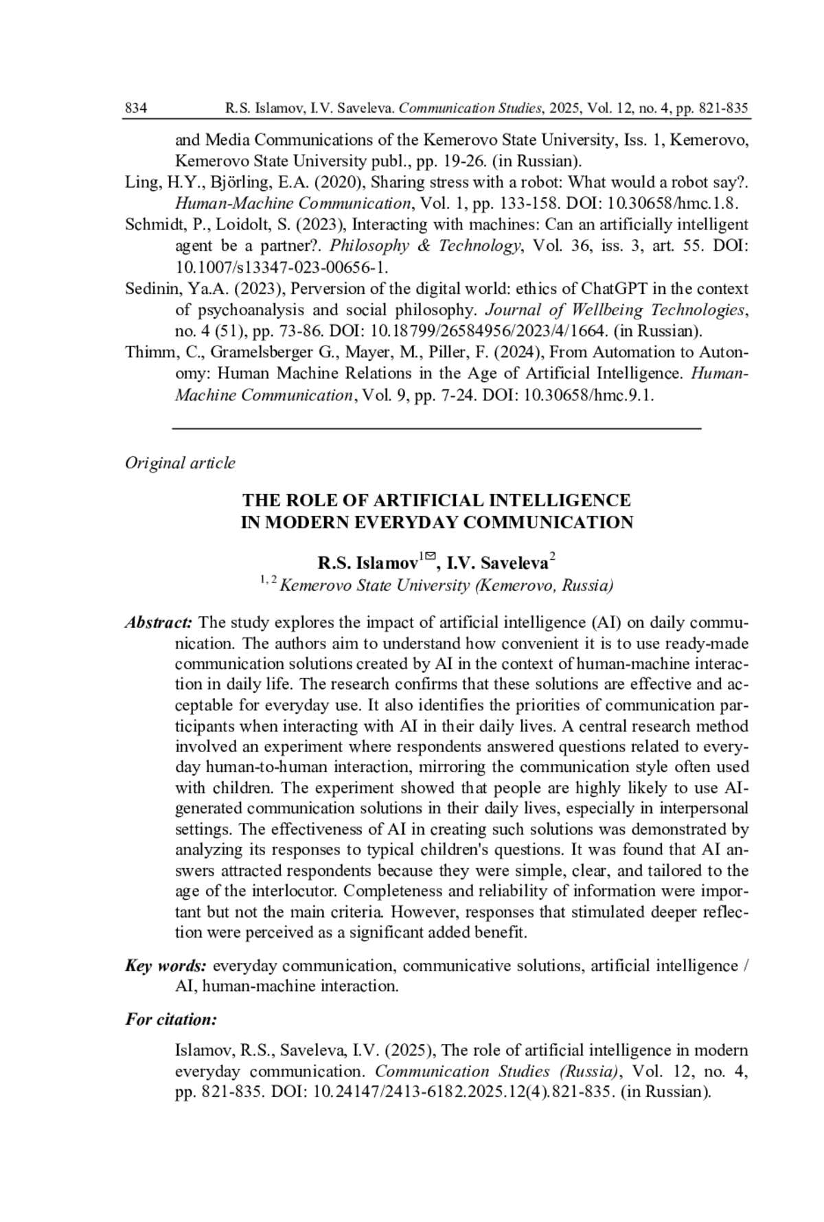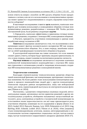 5. Ерещенко М.В., Богуславская В.В. Коммуникация с искусственным интеллектом в социальной сети: информирование, самопрезентация, воздействие // Коммуникативные исследования. 2024. Т. 11. № 2. С. 255-270. DOI: 10.24147/2413-6182.2024.11(2).255-270 EDN: HEVOCY