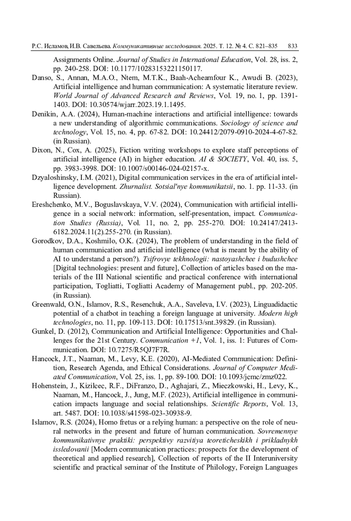 9. Danso S., Annan M.A.O., Ntem M.T.K., Baah-Acheamfour K., Awudi B. Artificial intelligence and human communication: A systematic literature review // World Journal of Advanced Research and Reviews. 2023. Vol. 19. No. 1. P. 1391-1403. DOI: 10.30574/wjarr.2023.19.1.1495 EDN: SPTBWK