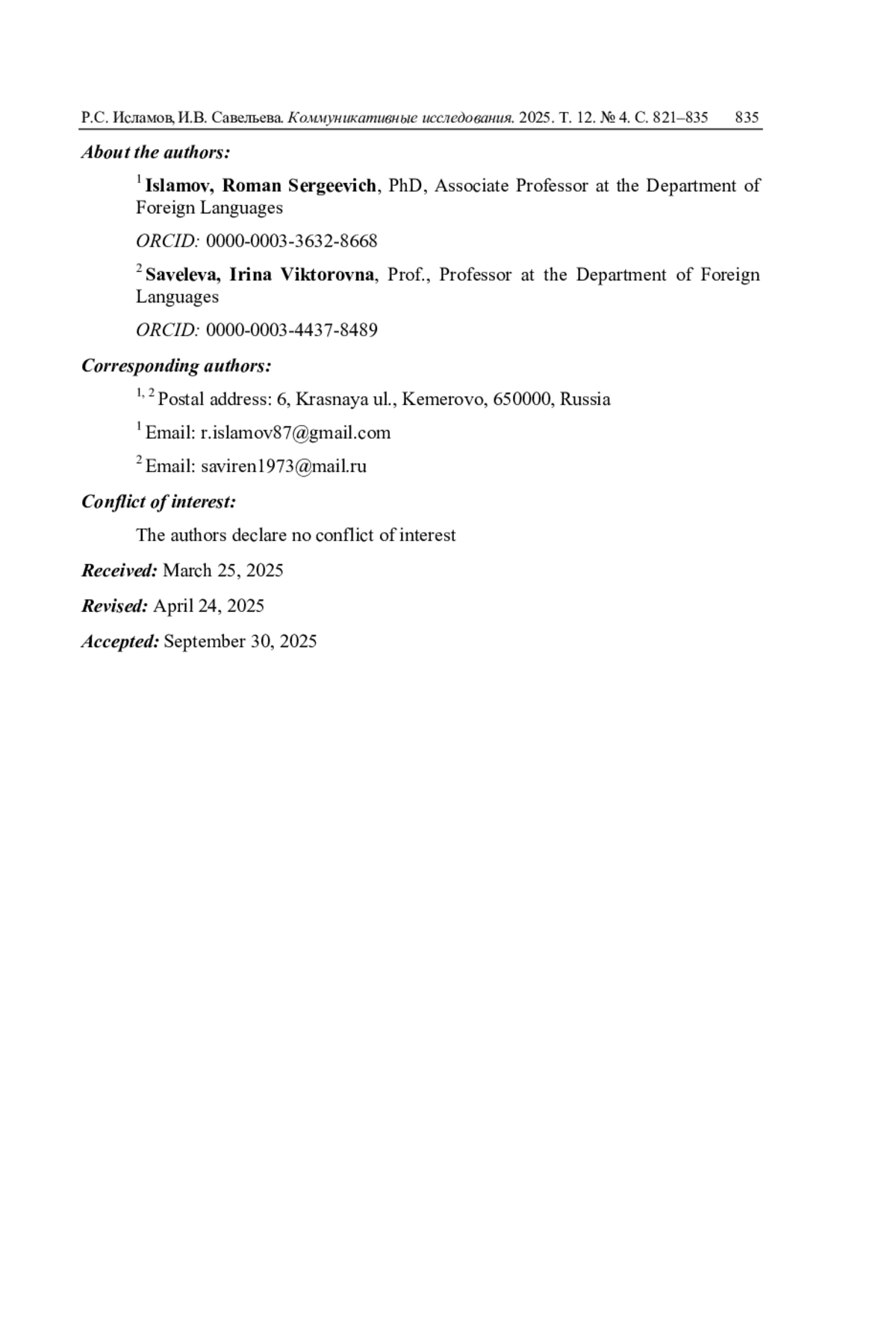 6. Исламов Р.С. Homo fretus или человек полагающийся: взгляд на роль нейросетей в настоящем и будущем человеческой коммуникации // Современные коммуникативные практики: перспективы развития теоретических и прикладных исследований: сб. докл. II Межвуз. науч.-практ. семинара Ин-та филологии, иностр. яз. и медиакоммуникаций КемГУ. Кемерово: Кемер. гос. ун-т, 2024. Вып. 1. С. 19-26. EDN: KFKQLF