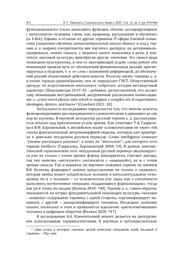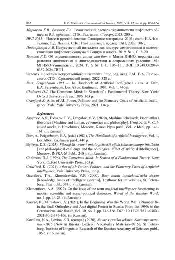 3. Волков В.В. Искусственный “интеллект” и человеческий ум: футуристическая синекдоха и реальность (лингвистический и лингвоментальный аспекты) // Вестник Российского университета дружбы народов. Серия: Теория языка. Семиотика. Семантика. 2020. Т. 11. № 4. С. 745-759. DOI: 10.22363/2313-2299-2020-11-4-745-759 EDN: FQFFYR