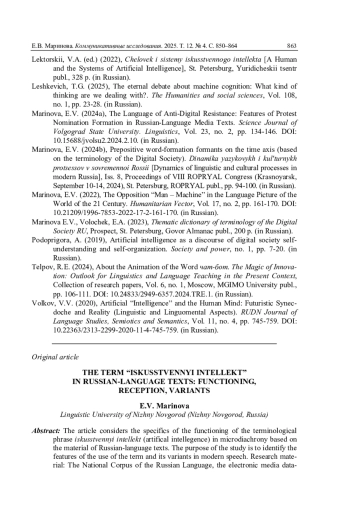 9. Маринова Е.В. Препозитивные словообразовательные форманты на оси времени (на материале терминологии цифрового общества) // Динамика языковых и культурных процессов в современной России. СПб.: РОПРЯЛ, 2024б. Вып. 8: Материалы VIII Конгресса РОПРЯЛ (г. Красноярск, 10-14 сент. 2024 г.). С. 94-100. EDN: CGIBUK