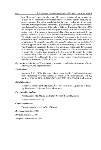 Рассматривается в микродиахронии специфика функционирования терминологического сочетания искусственный интеллект в русскоязычных текстах. Цель исследования - выявить особенности употребления термина и его вариантов в современной речи. Материал исследования: Национальный корпус русского языка, электронная медиабаза «Интегрум», научный дискурс. Методика исследования включает анализ семантики и комбинаторики термина; стилистический анализ; дискурсивный анализ. Установлено, что термин является многозначным: в его семантической структуре выделяются процессуальное, предметное, гносеологическое и экзистенциальное значения, по-разному проявляющие себя в разного типа дискурсах. Начиная с 1970-х гг. термин проходит путь от футурологемы, обозначающей фикциональное понятие, до техницизма-реалии. Изменение сочетаемости термина заметно по постепенному сокращению глагольных конструкций со значением поссесивности « Х обладает / наделен искусственным интеллектом », связанных с антропоморфным характером внутренней формы термина, и увеличению числа конструкций « Х оснастили <снабдили, оборудовали> искусственным интеллектом», типичных для использования техницизма при характеристике технического устройства. Динамика изменений в использовании термина искусственный интеллект, обусловленная стремительным развитием соответствующей технологии и широким внедрением ее достижений в повседневную жизнь, проявляется в увеличении частотности термина в медиа; детерминологизации; актуализации компактных субститутов термина, прежде всего ИИ; активности некодифицированных вариантов разной коннотации в медиатекстах ( ИИшка, ИскИн и др.