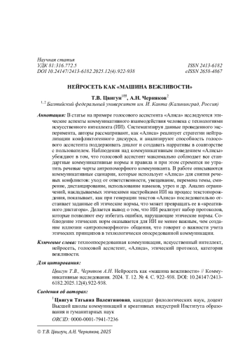 В статье на примере голосового ассистента «Алиса» исследуются этические аспекты коммуникативного взаимодействия человека с технологиями искусственного интеллекта (ИИ). Систематизируя данные проведенного эксперимента, авторы рассматривают, как «Алиса» реализует стратегии нейтрализации конфликтогенного дискурса, и анализируют способность голосового ассистента поддерживать диалог и создавать нарративы в соавторстве с пользователем. Наблюдения над коммуникативным поведением «Алисы» убеждают в том, что голосовой ассистент максимально соблюдает все стандартные коммуникативные нормы и правила и при этом стремится не утратить речевые черты антропоморфного коммуниканта. В работе описываются коммуникативные сценарии, которые использует «Алиса» для снятия речевых конфликтов: уход от ответственности, увещевание, перемена темы, смирение, дистанцирование, использование намеков, угроз и др. Анализ ограничений, накладываемых этическими настройками ИИ на процесс текстопорождения, показывает, как при генерации текстов «Алиса» последовательно отстаивает заданные ей этические нормы, что может превращать ее в «креативного диктатора». Делается вывод о том, что ИИ реализует набор протоколов, которые позволяют ему избегать ошибки, нарушающие этические нормы. Соблюдение этических норм оказывается для ИИ не менее важным, чем создание иллюзии «антропоморфного» общения, что говорит о важности учета этических принципов в технологически опосредованной коммуникации.