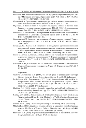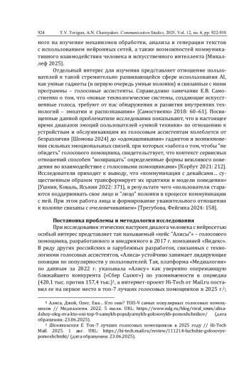 13. Ушкин С., Коваль Е., Яськин А. Жить с Алисой: как голосовые помощники трансформируют практики коммуникации? // Журнал исследований социальной политики. 2022. Т. 20. № 3. С. 361-376. DOI: 10.17323/727-0634-2022-20-3-361-376 EDN: BAWEPE