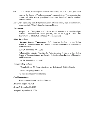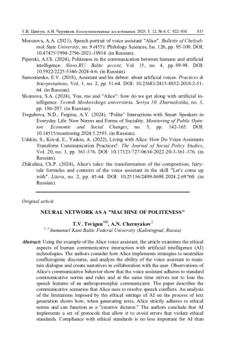 10. Пиперски А.Ч. Вежливость в коммуникации между человеком и искусственным интеллектом // Слово.РУ: Балтийский акцент. 2024. Т. 15. № 4. С. 89-98. DOI: 10.5922/2225-5346-2024-4-6 EDN: ACYHVY