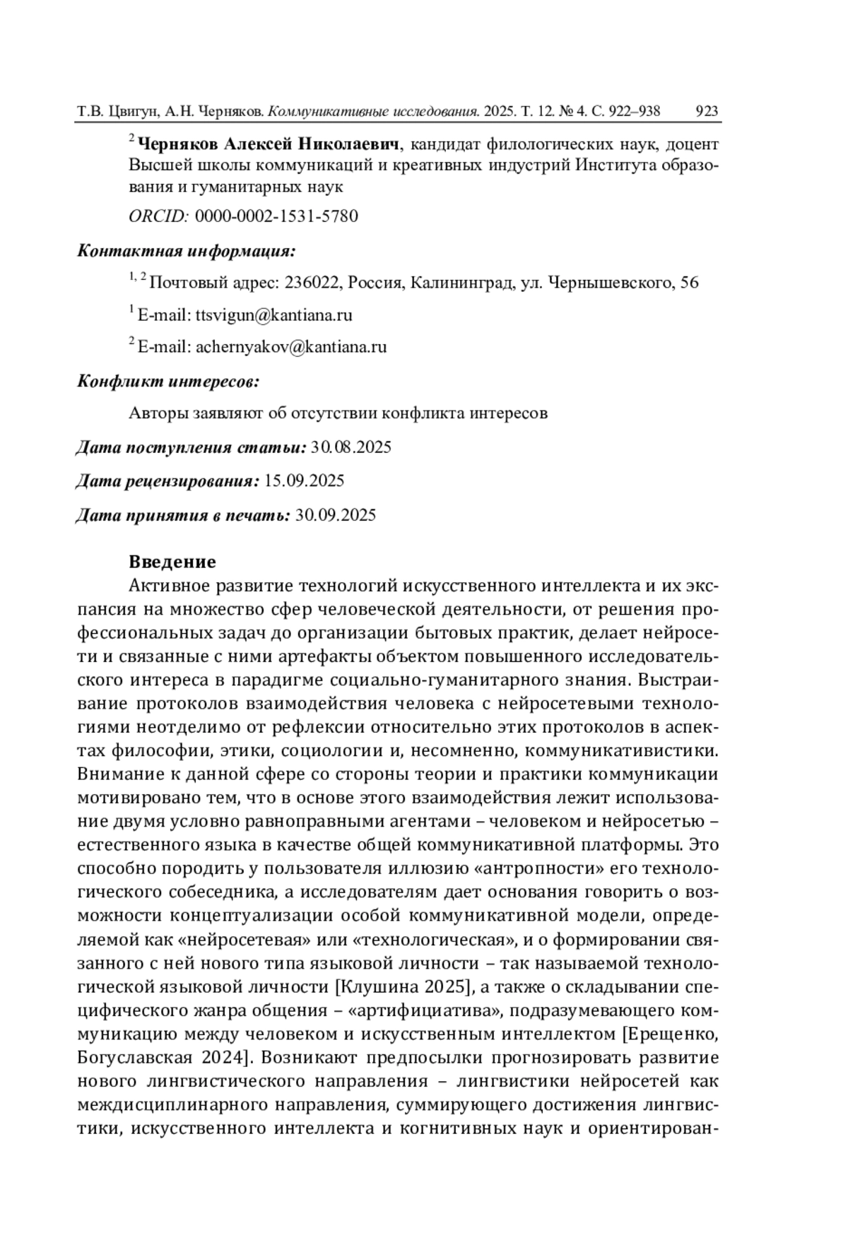 Активное развитие технологий искусственного интеллекта и их экспансия на множество сфер человеческой деятельности, от решения профессиональных задач до организации бытовых практик, делает нейросети и связанные с ними артефакты объектом повышенного исследовательского интереса в парадигме социально-гуманитарного знания. Выстраивание протоколов взаимодействия человека с нейросетевыми технологиями неотделимо от рефлексии относительно этих протоколов в аспектах философии, этики, социологии и, несомненно, коммуникативистики.