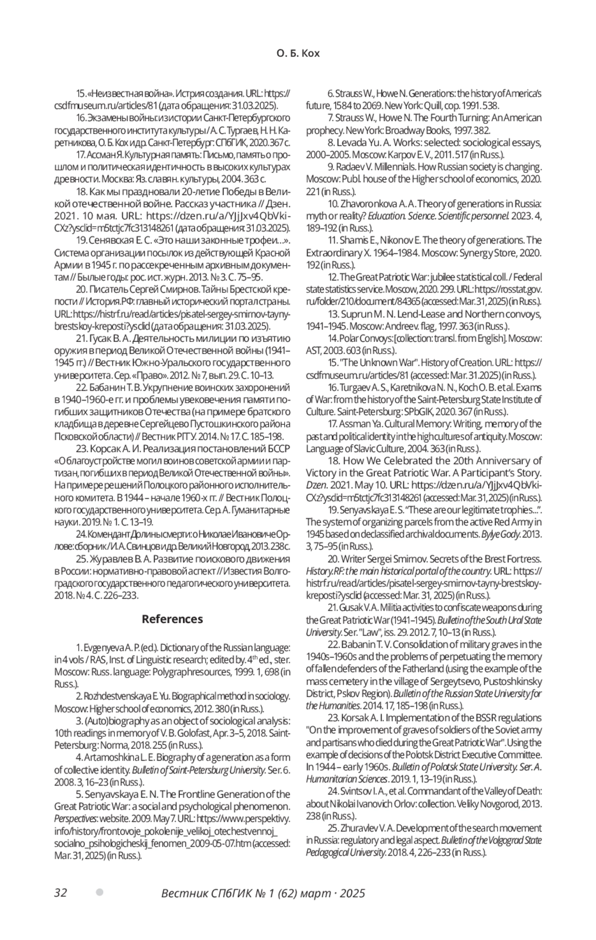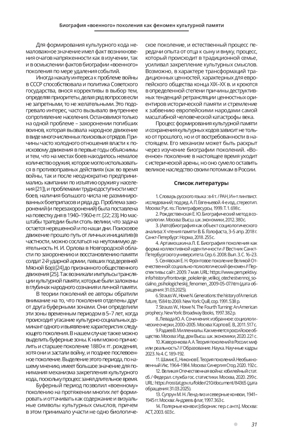 5. Сенявская Е. Н. Фронтовое поколение Великой Отечественной: социально-психологический феномен // Перспективы: сайт. 2009. 7 мая. URL: https://www.perspektivy.info/history/frontovoje_pokolenije_velikoj_otechestvennoj_socialno_psihologicheskij_fenomen_2009-05-07.htm (дата обращения: 31.03.2025).