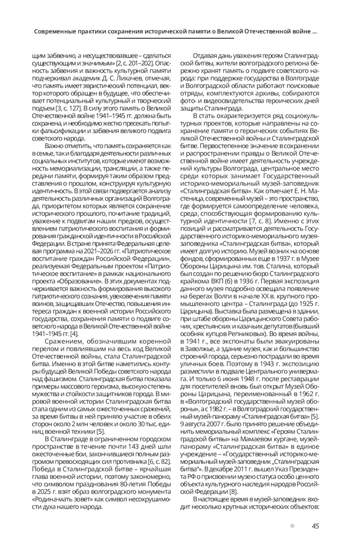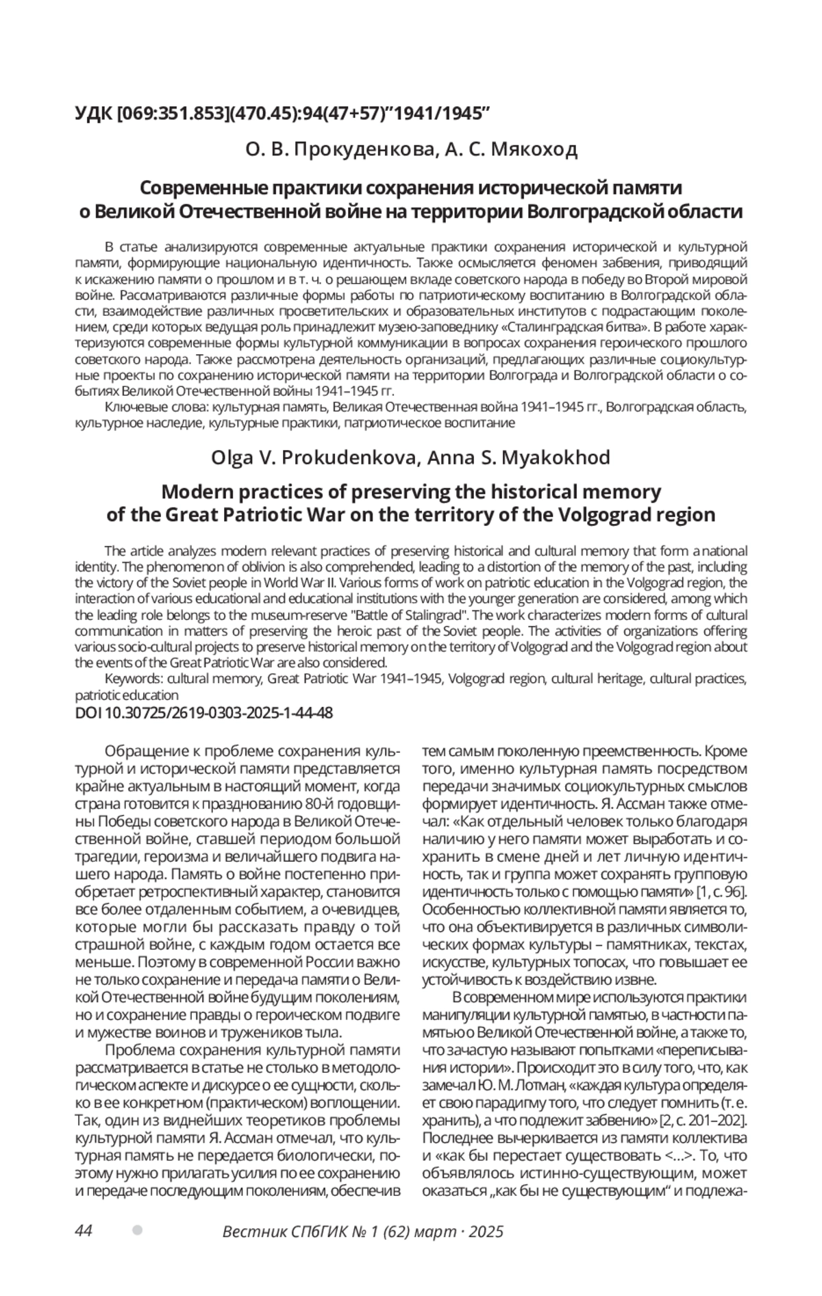 В статье анализируются современные актуальные практики сохранения исторической и культурной памяти, формирующие национальную идентичность. Также осмысляется феномен забвения, приводящий к искажению памяти о прошлом и в т. ч. о решающем вкладе советского народа в победу во Второй мировой войне. Рассматриваются различные формы работы по патриотическому воспитанию в Волгоградской области, взаимодействие различных просветительских и образовательных институтов с подрастающим поколением, среди которых ведущая роль принадлежит музею-заповеднику «Сталинградская битва». В работе характеризуются современные формы культурной коммуникации в вопросах сохранения героического прошлого советского народа. Также рассмотрена деятельность организаций, предлагающих различные социокультурные проекты по сохранению исторической памяти на территории Волгограда и Волгоградской области о событиях Великой Отечественной войны 1941-1945 гг.
