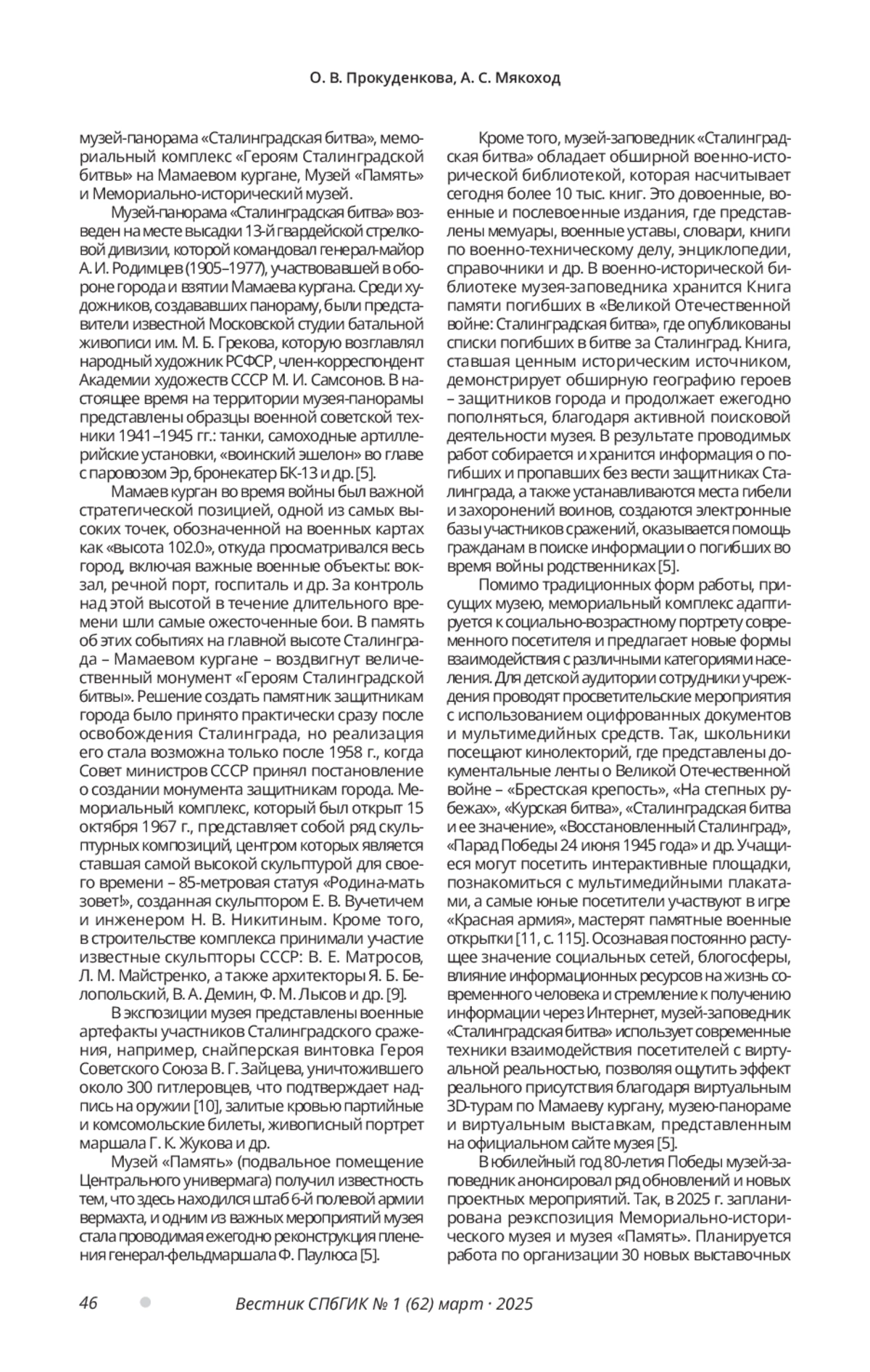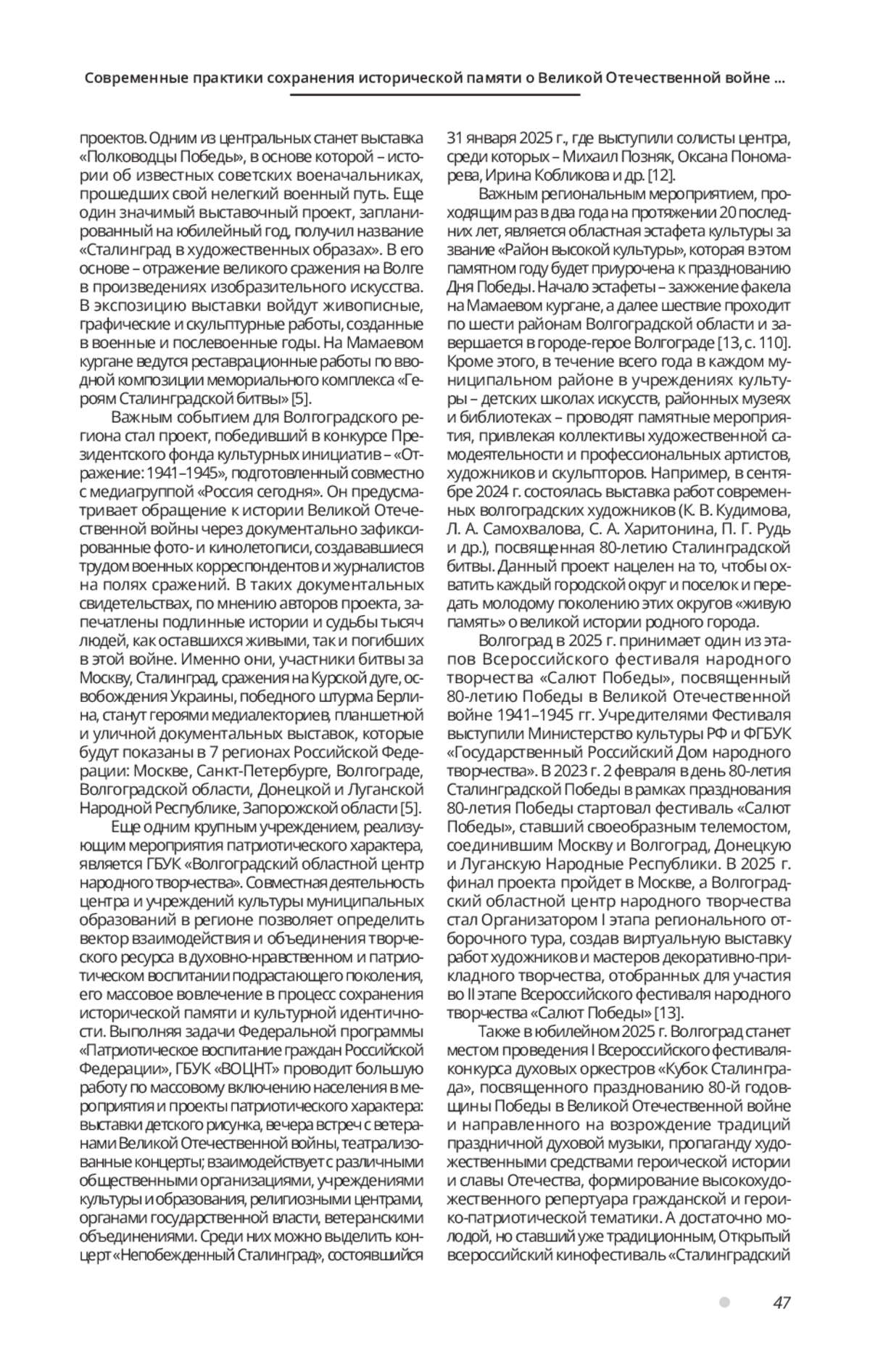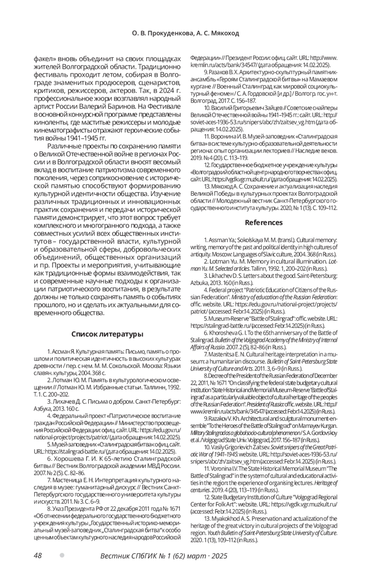 13. Мякоход А. С. Сохранение и актуализация наследия Великой Победы в культурных проектах Волгоградской области // Молодежный вестник Санкт-Петербургского государственного института культуры. 2020, № 1 (13). С. 109-112.