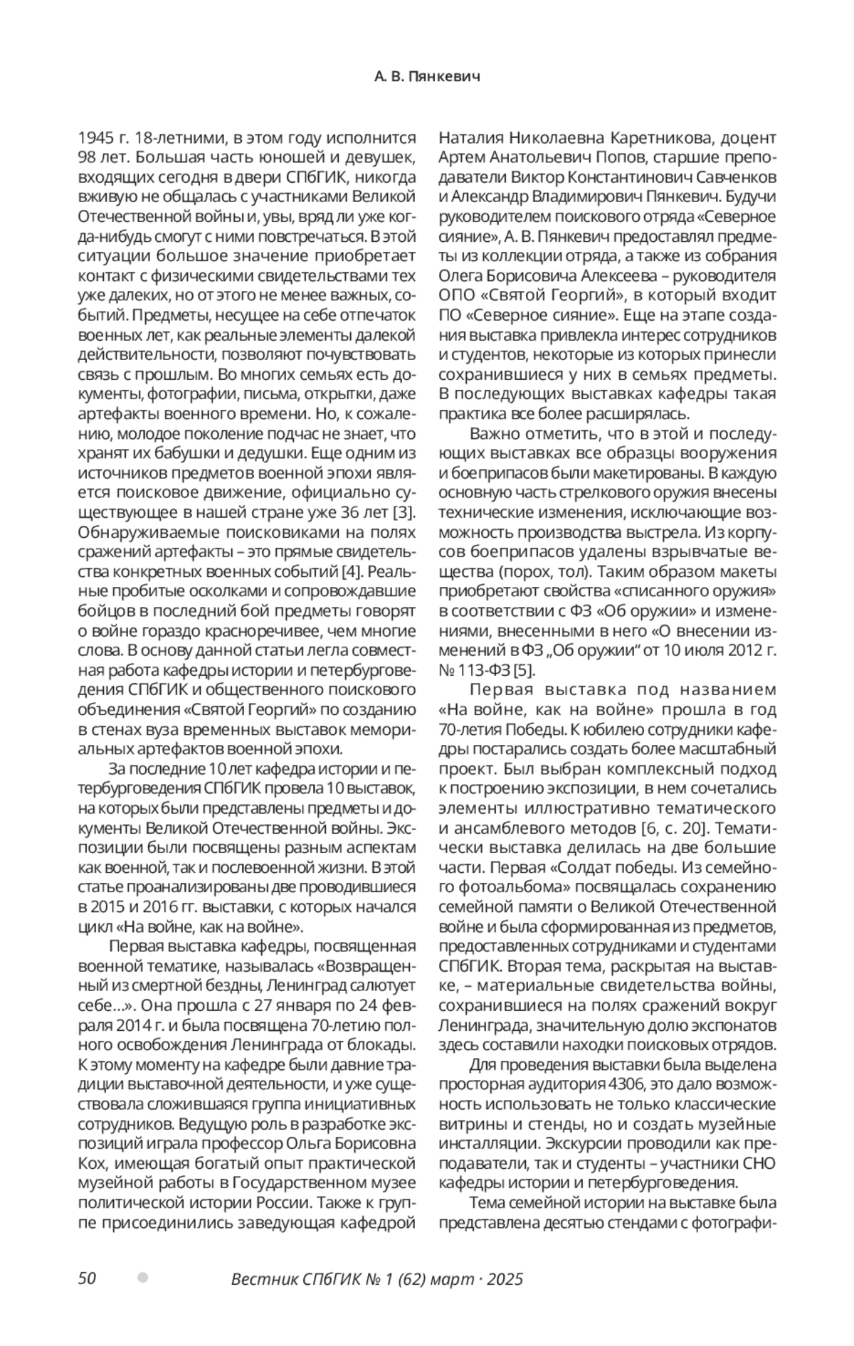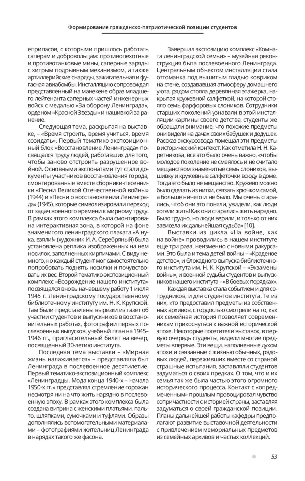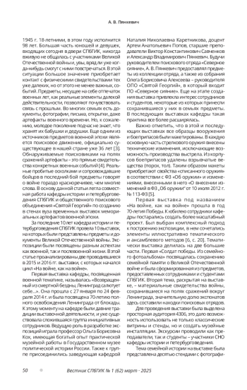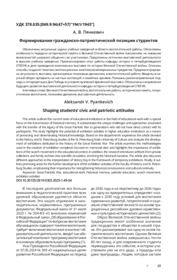 Обозначены актуальные задачи учебных заведений в области воспитательной работы. Обоснованы особенности передачи исторической памяти о Великой Отечественной войне поколениям, не имевшим возможностей широкого общения с ее участниками. Предложены источники выставочной деятельности в высшем учебном заведении. Проанализирован опыт работы кафедры истории и петербурговедения СПбГИК в деле проведения комплексных выставок по истории Великой Отечественной войны. Описаны способы создания тематико-экспозиционных комплексов мемориальных предметов. Продемонстрирована актуальность выставок, организуемых поисковым движением, в воспитательной работе. Введены в научный оборот артефакты из частных коллекций и семейных архивов. Показаны разнонаправленные подходы к интерпретации Дня Победы в условиях вузовской временной выставки. Обозначены направления будущего развития выставочной деятельности кафедры истории и петербурговедения СПбГИК.