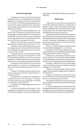 6. Андреева И. В. Метод музейно-экспозиционного проектирования как основание классификации музейных экспозиций // Вопросы музеологии. 2019. № 1. С. 16-28. EDN: XTNMLW