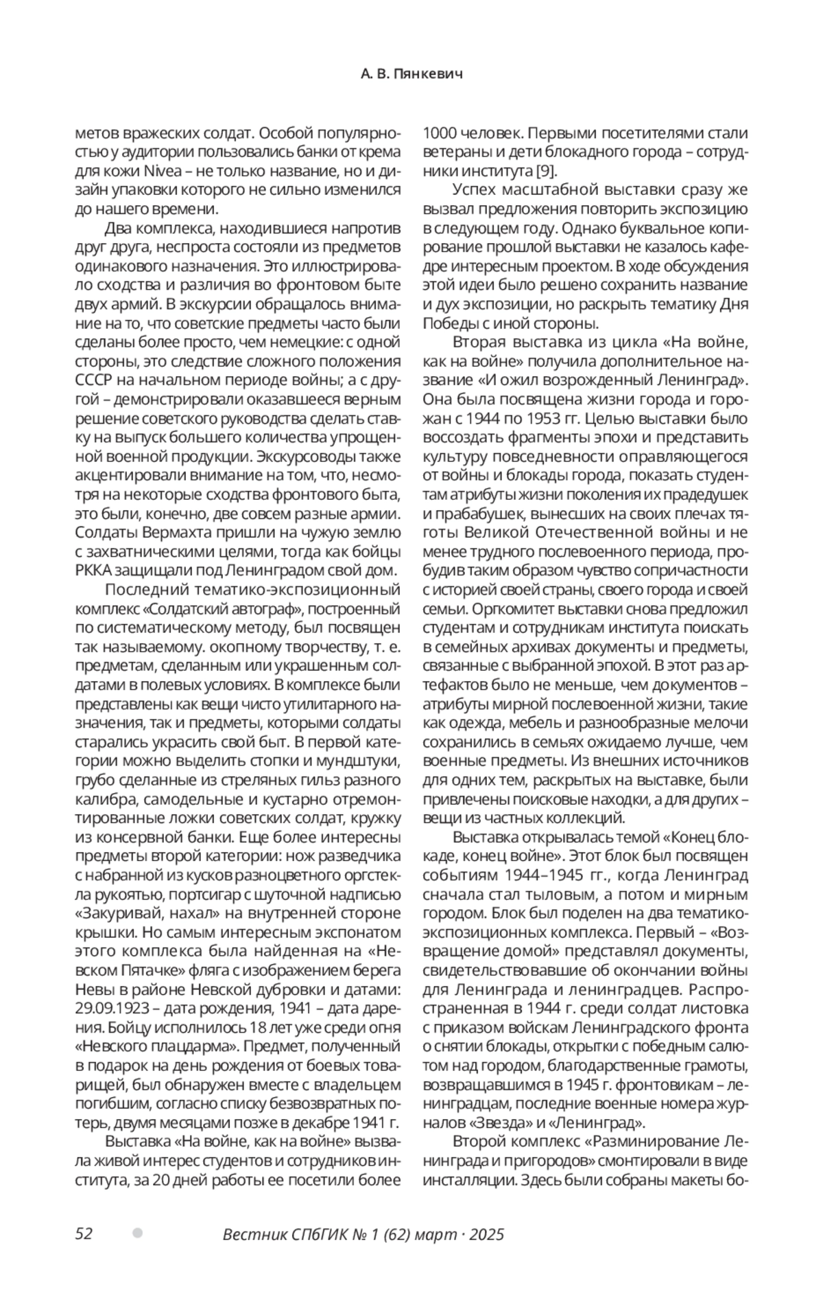 4. Пянкевич А. В. Выставочная деятельность поисковых отрядов: сохранение исторической памяти // Вестник Санкт-Петербургского государственного института культуры. 2019. № 1 (38). С. 129-133. EDN: ZAMUZV