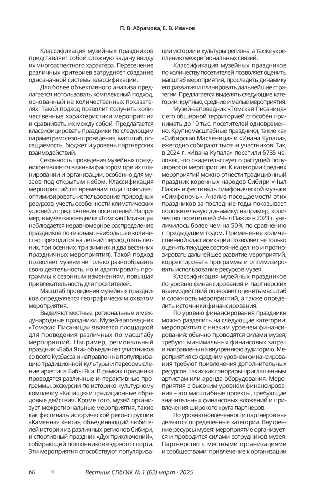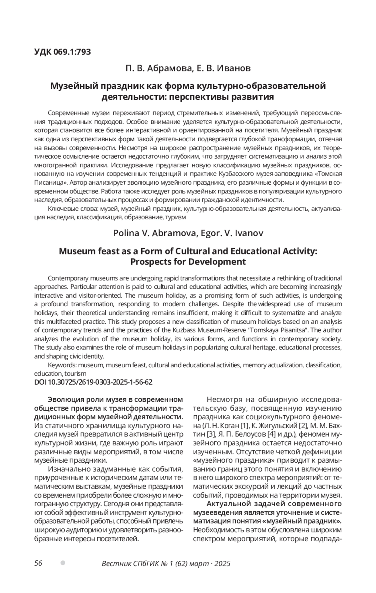 Современные музеи переживают период стремительных изменений, требующий переосмысления традиционных подходов. Особое внимание уделяется культурно-образовательной деятельности, которая становится все более интерактивной и ориентированной на посетителя. Музейный праздник как одна из перспективных форм такой деятельности подвергается глубокой трансформации, отвечая на вызовы современности. Несмотря на широкое распространение музейных праздников, их теоретическое осмысление остается недостаточно глубоким, что затрудняет систематизацию и анализ этой многогранной практики. Исследование предлагает новую классификацию музейных праздников, основанную на изучении современных тенденций и практике Кузбасского музея-заповедника «Томская Писаница». Автор анализирует эволюцию музейного праздника, его различные формы и функции в современном обществе. Работа также исследует роль музейных праздников в популяризации культурного наследия, образовательных процессах и формировании гражданской идентичности.