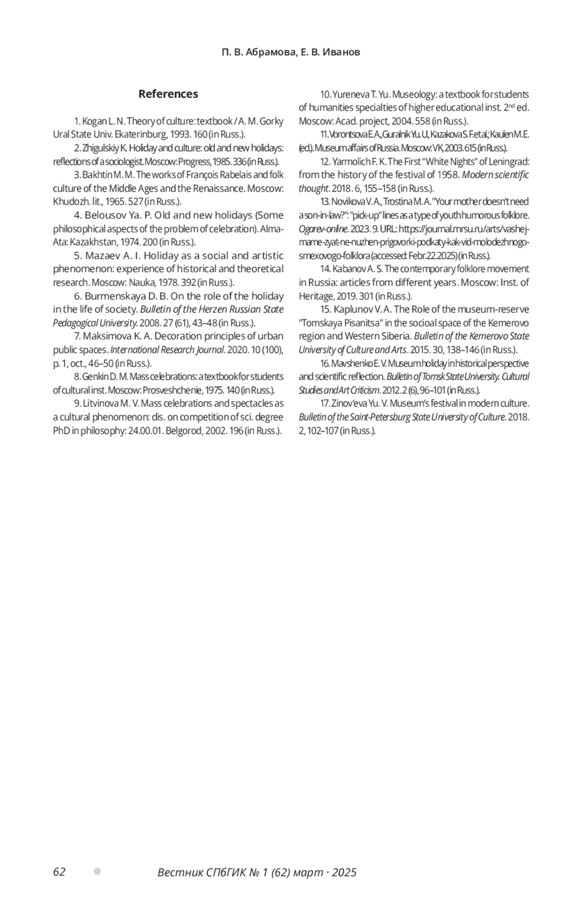 14. Кабанов А. С. Современное фольклорное движение в России: ст. разных лет. Москва: Ин-т Наследия, 2019. 301 с. EDN: ZTISHJ