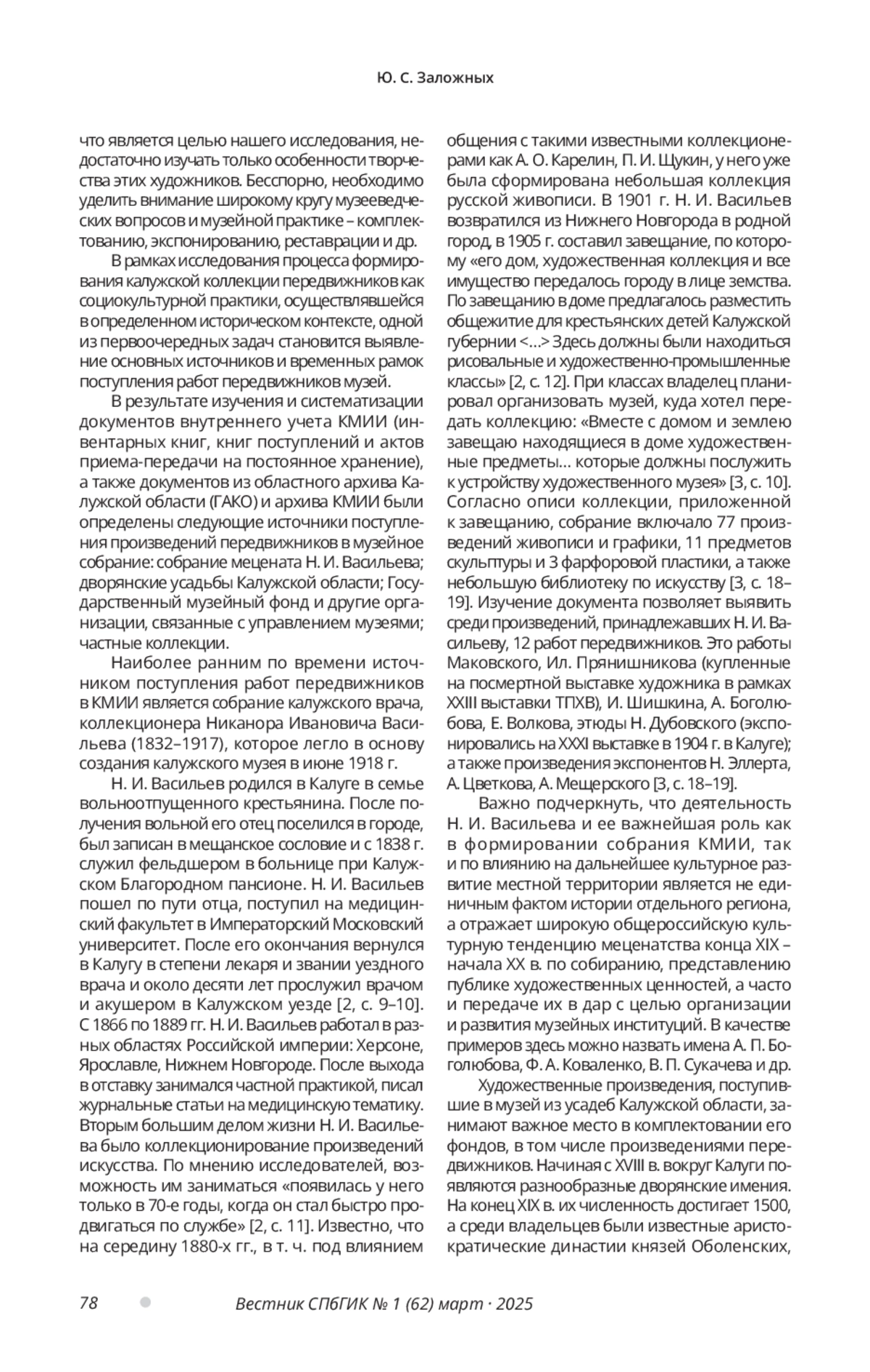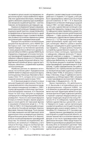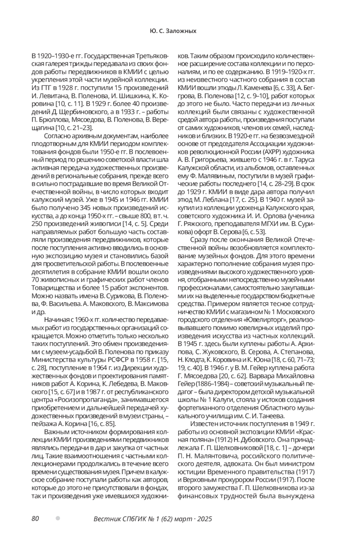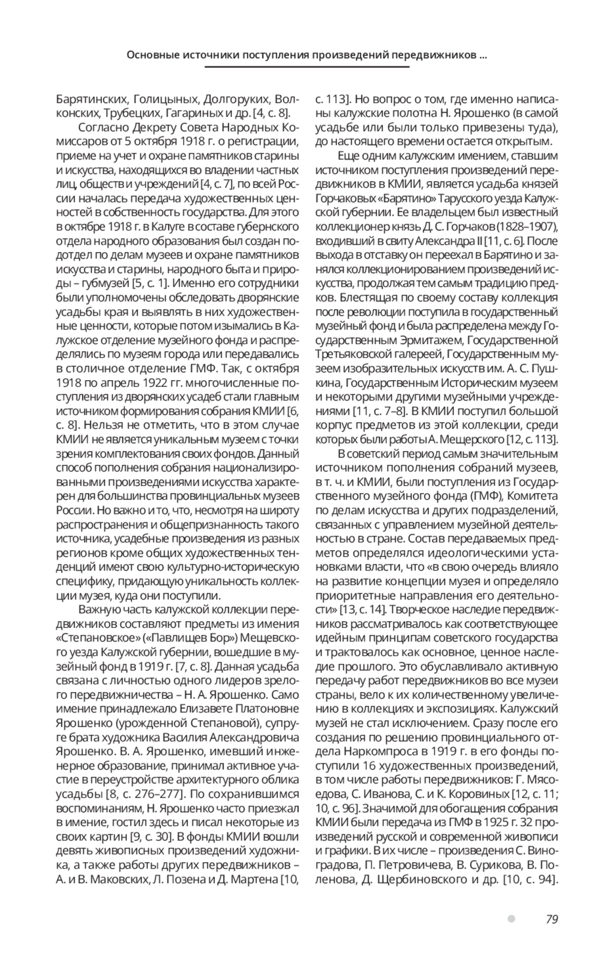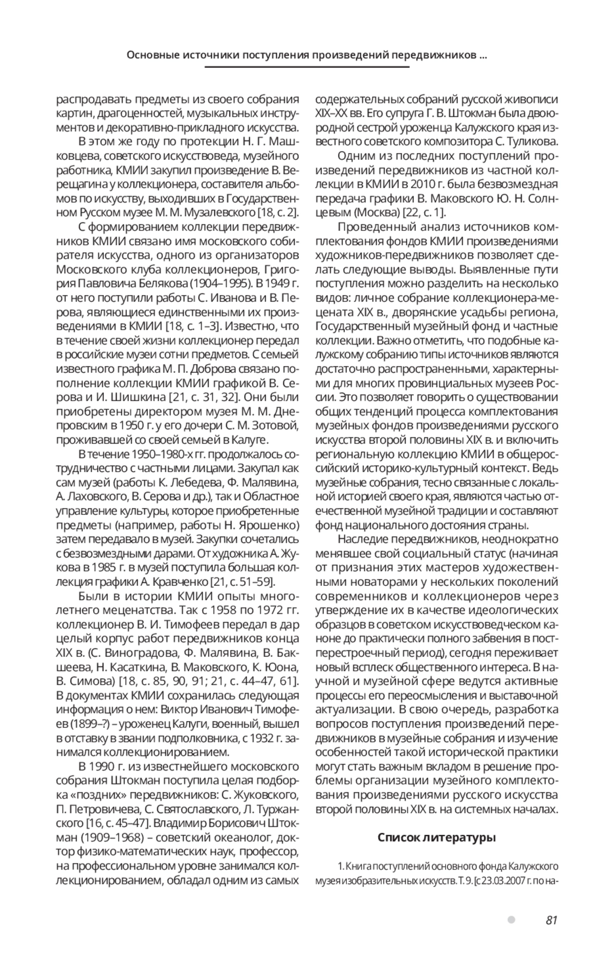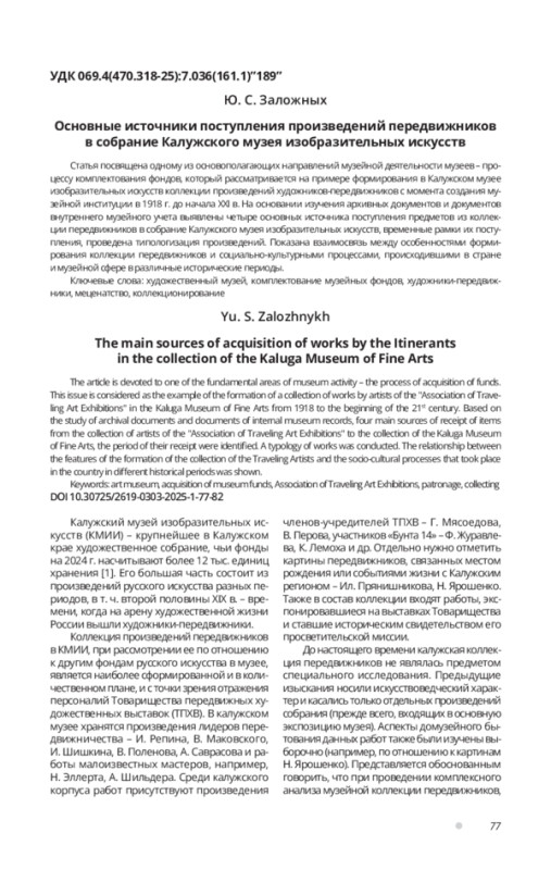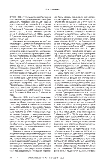 Статья посвящена одному из основополагающих направлений музейной деятельности музеев - процессу комплектования фондов, который рассматривается на примере формирования в Калужском музее изобразительных искусств коллекции произведений художников-передвижников с момента создания музейной институции в 1918 г. до начала ХХI в. На основании изучения архивных документов и документов внутреннего музейного учета выявлены четыре основных источника поступления предметов из коллекции передвижников в собрание Калужского музея изобразительных искусств, временные рамки их поступления, проведена типологизация произведений. Показана взаимосвязь между особенностями формирования коллекции передвижников и социально-культурными процессами, происходившими в стране и музейной сфере в различные исторические периоды.