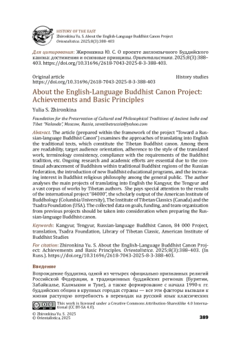 В работе, подготовленной в рамках проекта «К русскоязычному буддийскому канона», рассматриваются основные подходы к переводу на английский язык традиционных письменных источников, входящих в состав тибетского буддийского канона, в том числе: удобочитаемость, ориентированность на целевую аудиторию, соблюдение стиля переводимого сочинения, согласованность терминологии, соблюдение требований со стороны буддийской традиции и т. д. Автор подробно анализирует основные проекты по переводу на английский язык Кангьюра, Тэнгьюра и обширного свода произведений тибетских авторов, уделяя особое внимание международному проекту «84000», деятельности Американского института буддологии при Колумбийском Университете (США), Института тибетской классики (Канада) и фонда «Цадра» (США). Приведенные в работе данные о целях, достижениях, перспективных планах, источниках финансирования и организации коллективной работы в рамках перечисленных инициатив может быть учтено в ходе дальнейшего формирования русскоязычного буддийского канона, потребность в котором продиктована поступательным развитием буддизма в традиционных буддийских регионах Российской Федерации, запуском новых образовательных программ и ростом интереса широкой публики в философии буддизма.