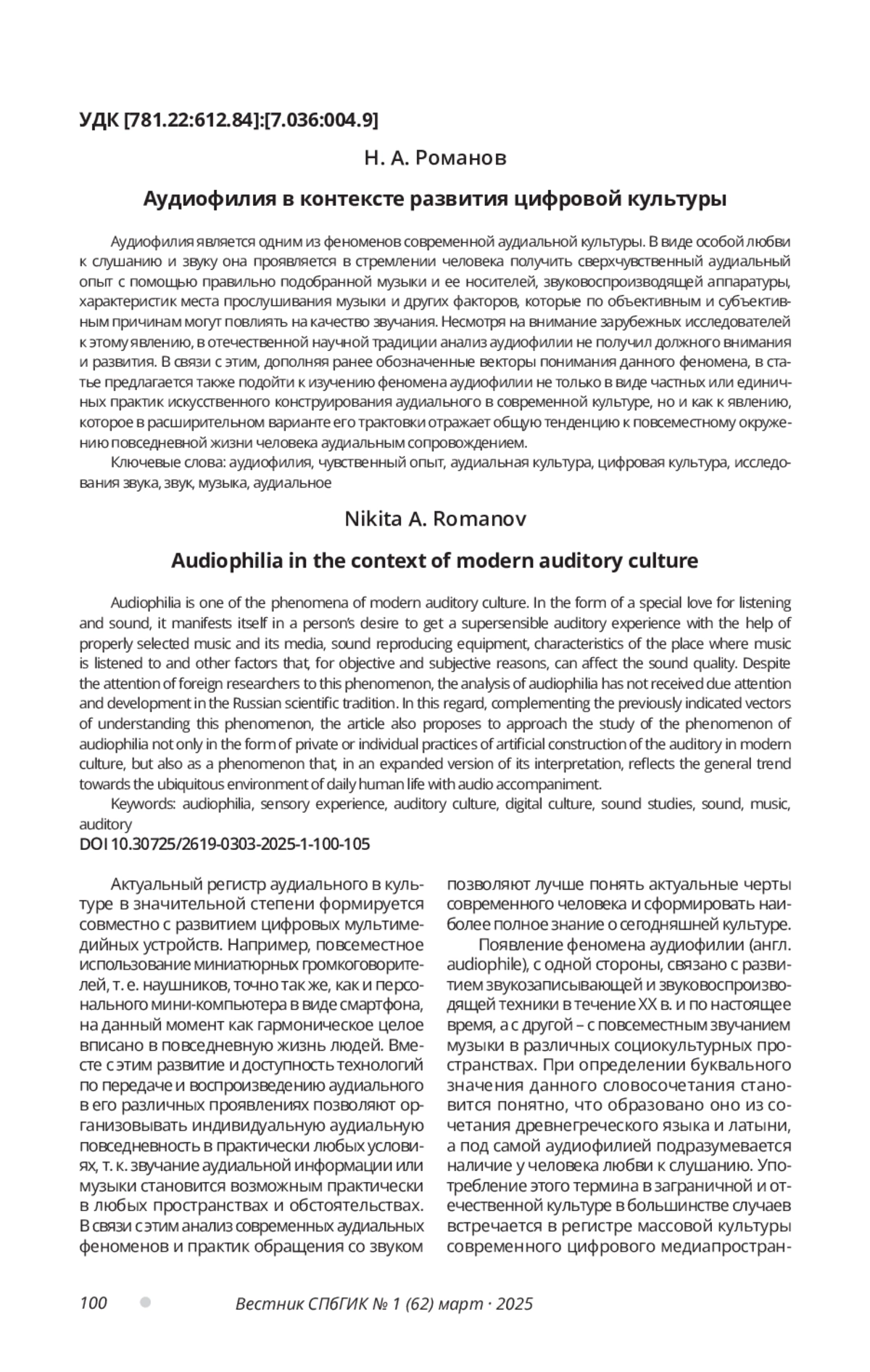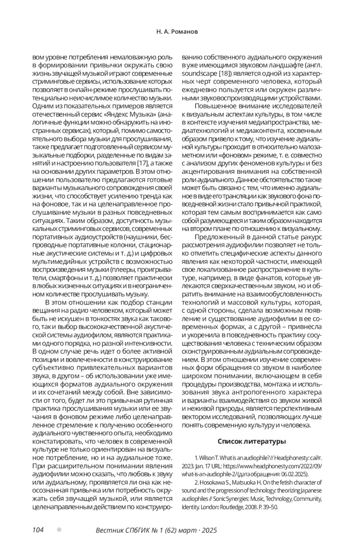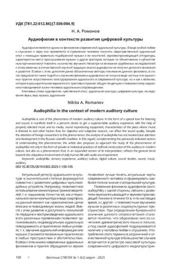 17. Романов Н. А. “Меблировочная музыка” и “Яндекс Музыка”: к изучению современного субъекта культуры // Культура и технологии. 2023. Т. 8, № 3. С. 114-121. EDN: QLYQFL