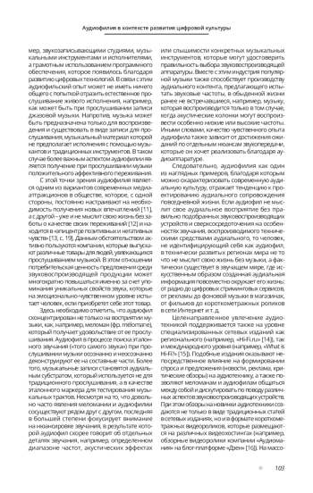 В контексте научного дискурса употребление термина «аудиофилия» встречается в основном среди зарубежных исследователей. Среди тематических рубрик, которые обозначаются при изучении феномена аудиофилии, выделяются следующие: эмоциональная составляющая аудиофильской культуры и формирование в связи с этим социальной идентичности [2], вопросы аудиофильской эстетики [3], аудиофилия в контексте коммуникационной деятельности [4], прослушивание музыки в домашних условиях с использованием высококачественной аудиоаппаратуры как культурная практика [5] и др.