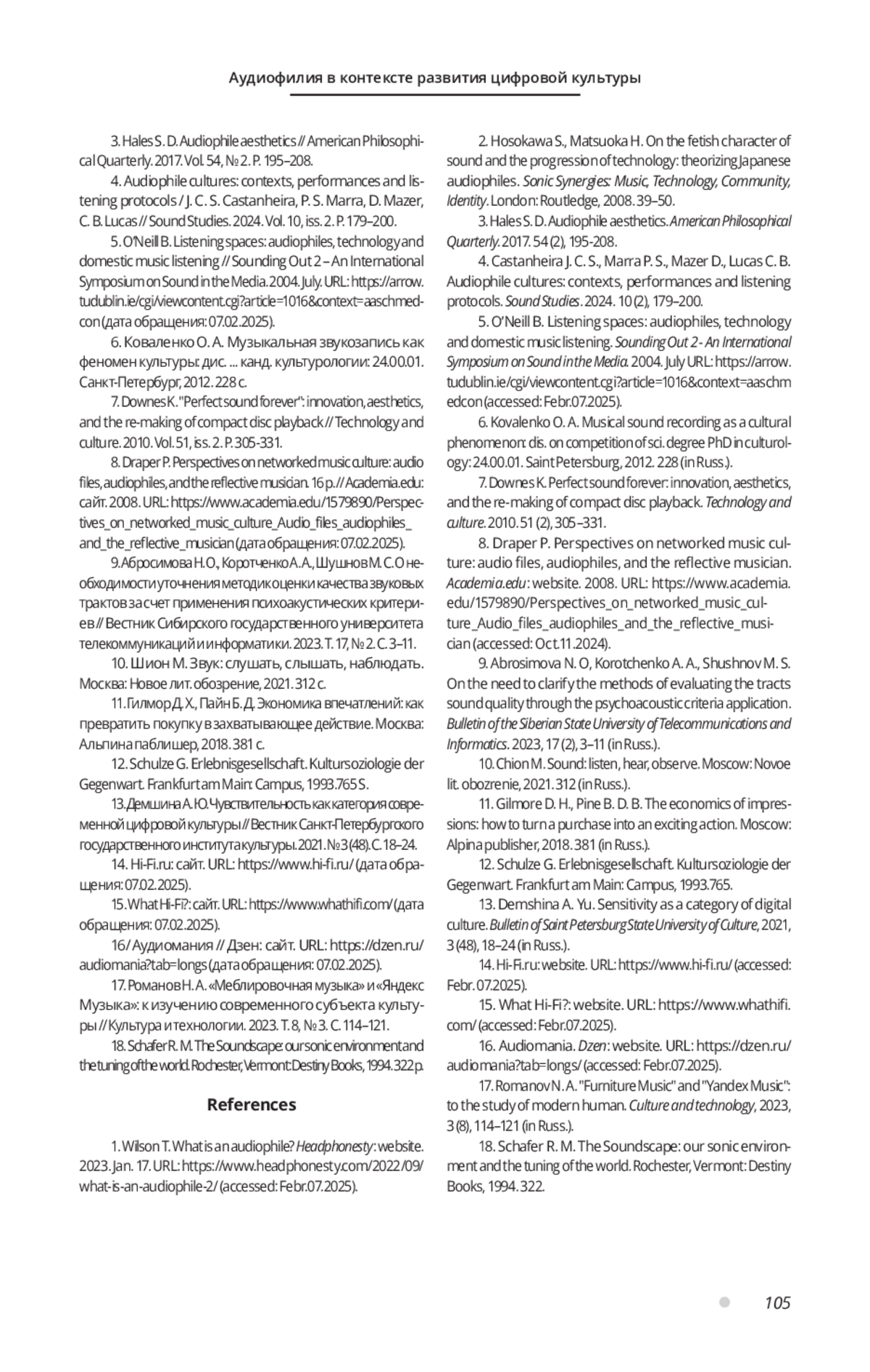 3. Hales S. D. Audiophile aesthetics // American Philosophical Quarterly. 2017. Vol. 54, № 2. P. 195-208.